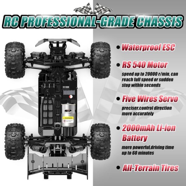 【Large Capacity Battery】Different from other rc cars for adults equipped with 850-1300mAh batteries, we provide 2 X 7.4V 2000mAh high-capacity batteries to support rc truck to run 60 mins at normal speed. With these batteries, rc cars can travel at ultra-high speed for longer time and players can get longer exciting gaming experience.