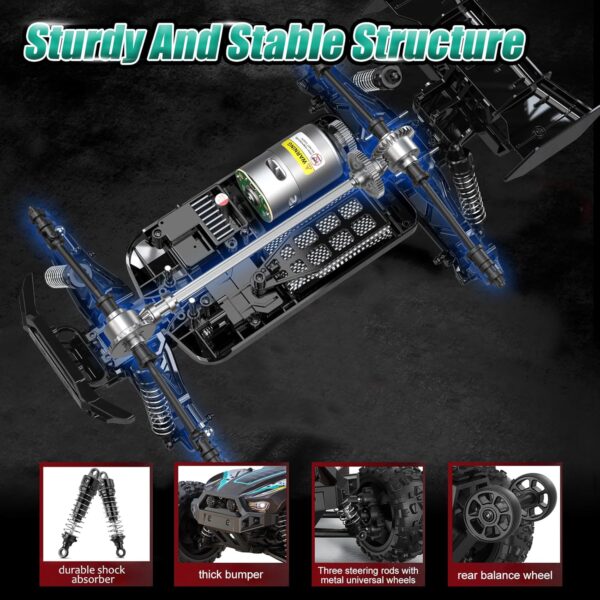 【Powerful Motor】Rc cars powered by RS-540 high-speed DC motor. This motor and continuous and efficient transmission system enables the rc car to reach a high speed of 60KPH quickly or brake in time. The upgraded 5-wire servo ensures that the remote control car can accurately control the direction while high speed running.