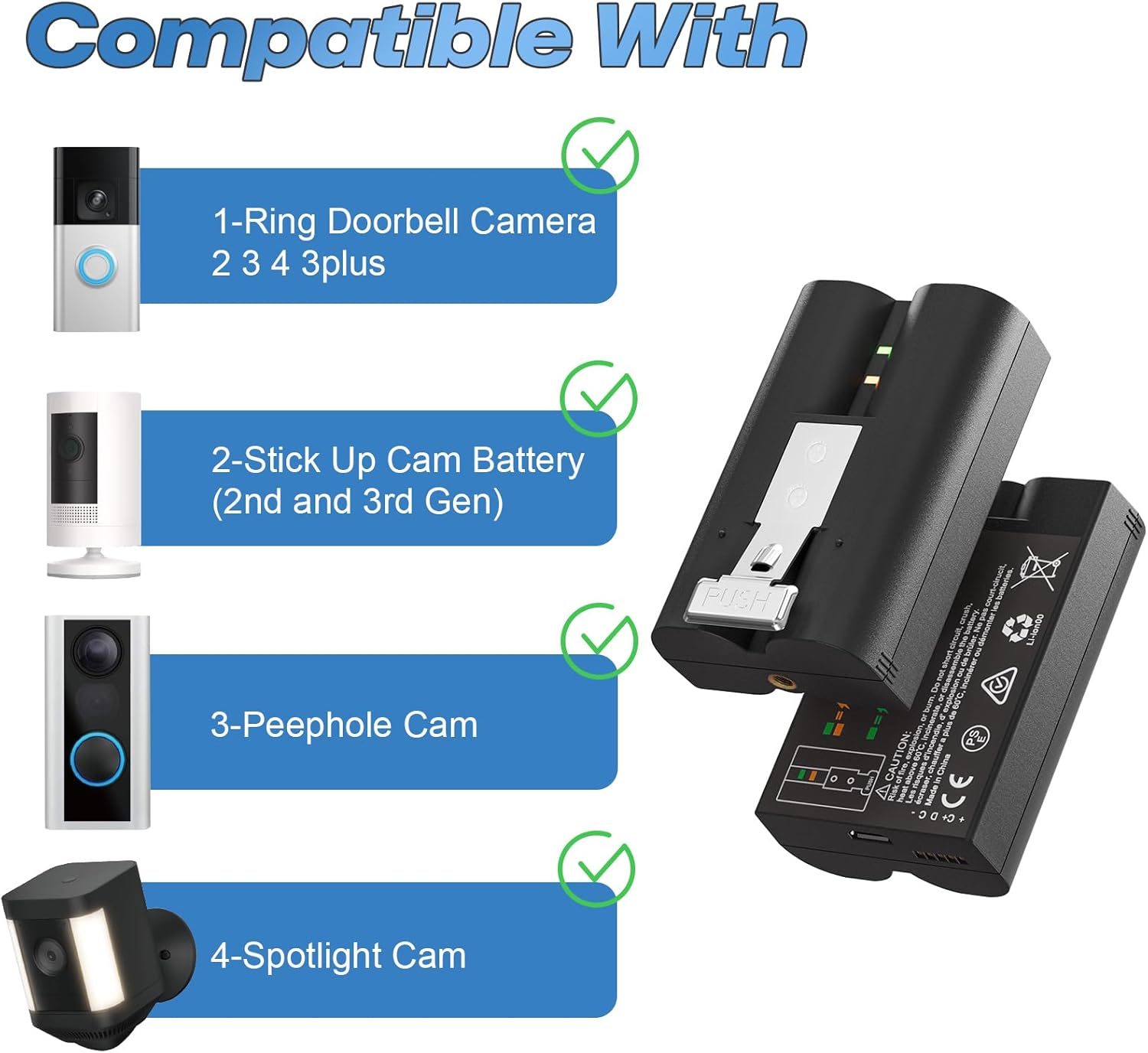 Wide Compatibility: Our product serves as a perfect replacement ring battery 2 pack for Ring Doorbell Camera 2/3/4/3plus, Stick Up Cam Battery (2nd and 3rd Gen), Peephole Cam, Spotlight Cam, and Smart Lighting Solar Floodlight. Our ring doorbell battery ensures seamless compatibility, allowing you to make your purchase with confidence, without any worries about compatibility issues.