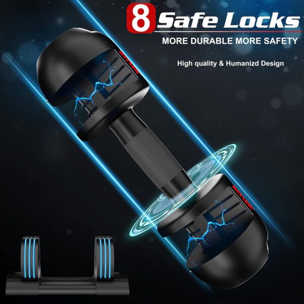 Safe Locking System- We are applying a strong structural and 100% safety ensured lock system both on the counterweight and on the tray, which ensure the dumbell set are fastened stably and tightly to ensure your safety. No more weight plate fallen off during exercise