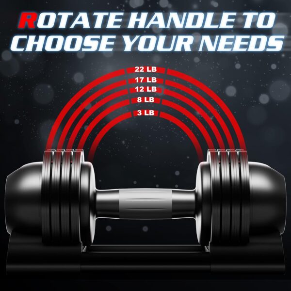 Adjustable Weight – Come with 2pcs dumbbell set. Each adjustable weight dumbbell features free weight adjustment from 3- 8-12-17-22lb, the total weight of dumbbell set is 44lb. Suitable for beginners to professional. Committed to meet your needs for diversified weight training, it is a great choice for modify muscle lines and strong muscle fibers