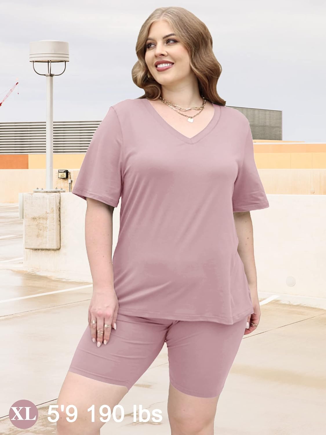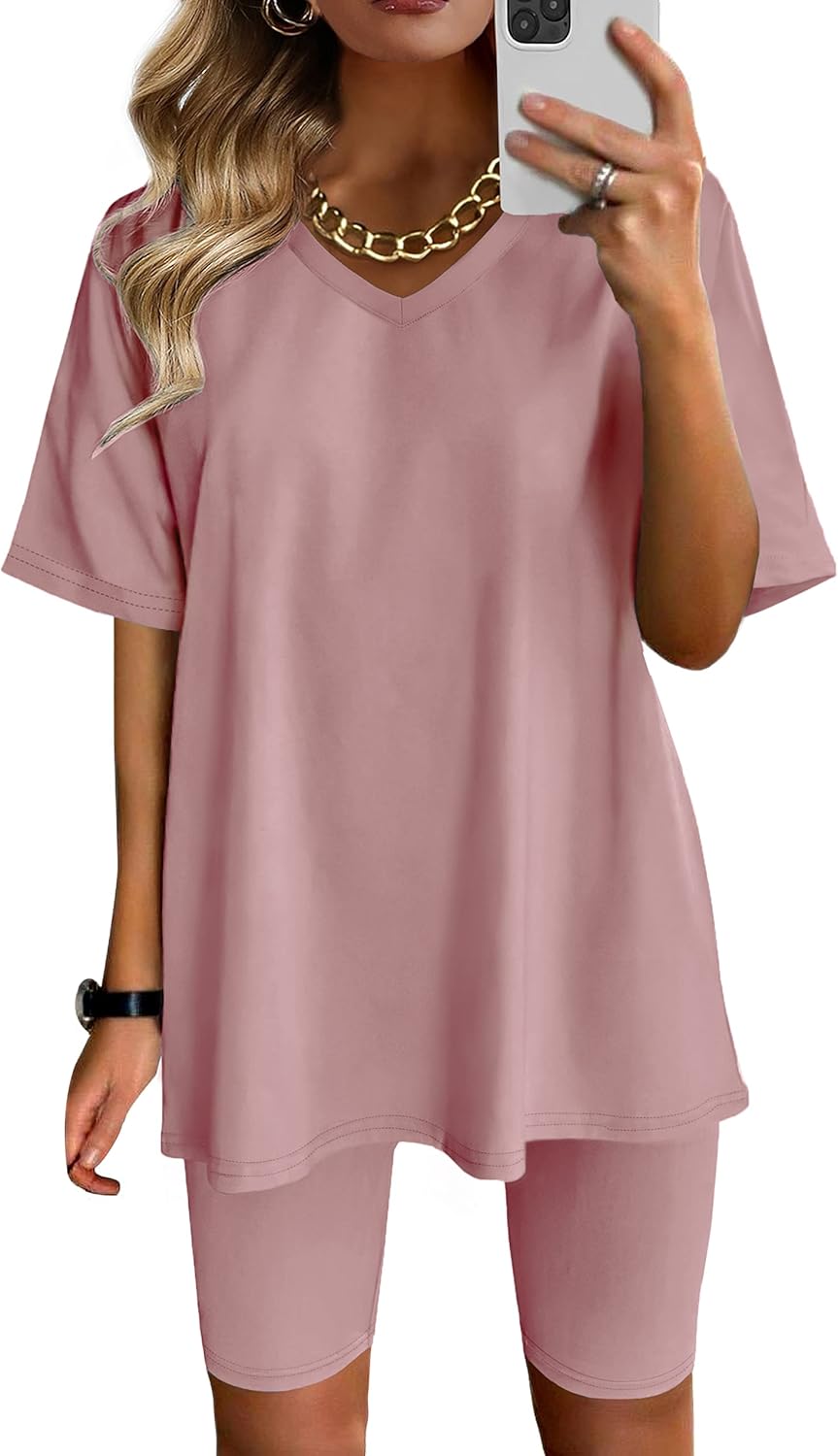 2 piece tracksuit sweatsuit,high waist biker shorts,loose t shirt top,not overly tight and not overly loose but definitely room to breath.