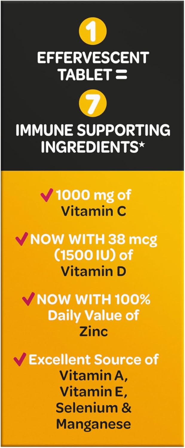 VITAMIN C 1000mg: Airborne immune support effervescent tablets are packed with 1000mg Vitamin C per serving, which helps support your immune system. ZINC SUPPLEMENT: These Vitamin C with Zinc effervescent tablets NOW contain 100 percent of your daily value of Zinc, which plays a central role in your immune system and is essential for the functioning and signaling of immune cells. VITAMIN D SUPPLEMENTS: These fizzy drink tablets NOW contains 15000IU of Vitamin D3, important for proper functioning of the immune system*. POWERFUL ANTIOXIDANTS: Airborne immune support tablets contains the antioxidants Vitamin A to support immune health, Vit C to support immune health, Vitamin E to help fight free radicals, and Zinc to help maintain healhy immune cells. COMPLETE FORMULA: This crafted blend of 7 immune support vitamins is our most complete immune support formula yet.* It comes with minerals & herbs and it is an excellent source of Zinc and Selenium. NUMBER ONE IMMUNE SUPPORT EFFERVESCENT BRAND: Airborne is the Number 1 Immune Support Gummy, Effervescent & Chewable Brand (Based on unit sales L52W through 7/24/2024). SUGAR FREE: Airborne Immune Support Effervescent Tablets are Sugar Free, Gluten Free, Lactose Free, Caffeine Free, and manufactured in the USA with ingredients sourced globally. TASTY & CONVENIENT: Add this refreshing Zesty Orange flavored drink to your travel essentials. These dissolvable Vitamin C tablets are convenient and easy for adults and for kids 12plus to take at home or on the go. HOW TO ENJOY: Drop one of these mens multivitamins & women multivitamins tablets into 4-6 ounces of water, let it dissolve and drink. These drinks are so delicious so you can enjoy with your kids 9 years of age and above. *These statements have not been evaluated by the Food and Drug Administration. This product is not intended to diagnose, treat, cure or prevent any disease.