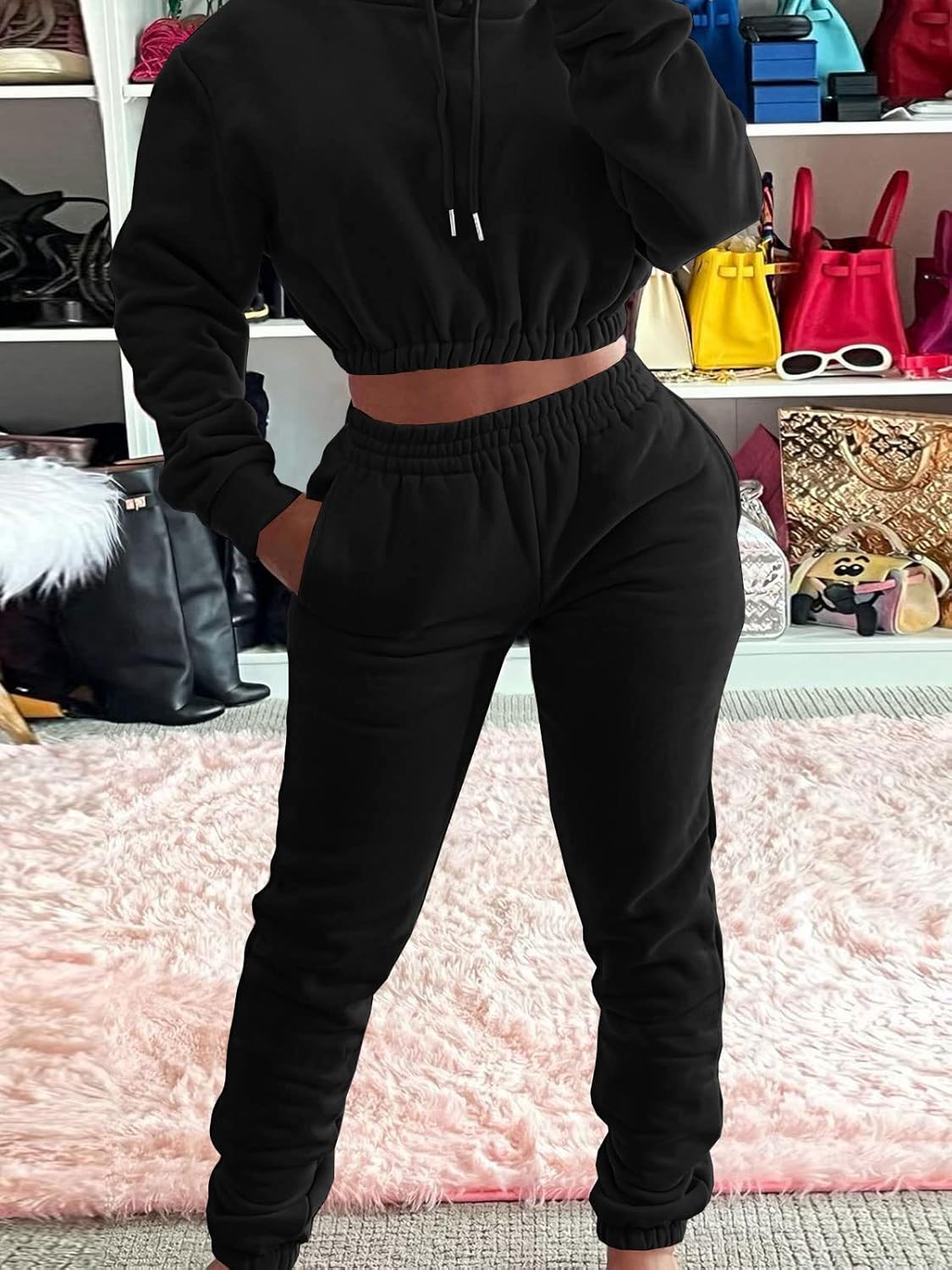 Long sleeve crop hoodie with elastic ribbon hem, Drawstring hood.Elastic waist long sweatpants with two side slant pockets, Loose fit, Easy to wear.