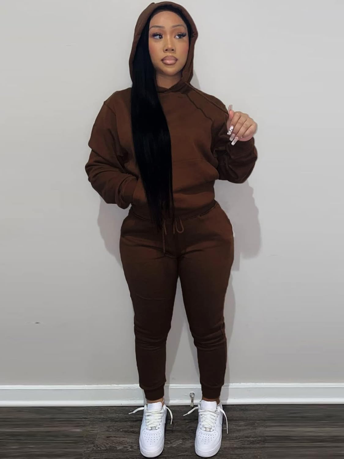 Women jogger outfits sets with kangaroo pocket not only could keep some things, but keep your hands warm in cold days.