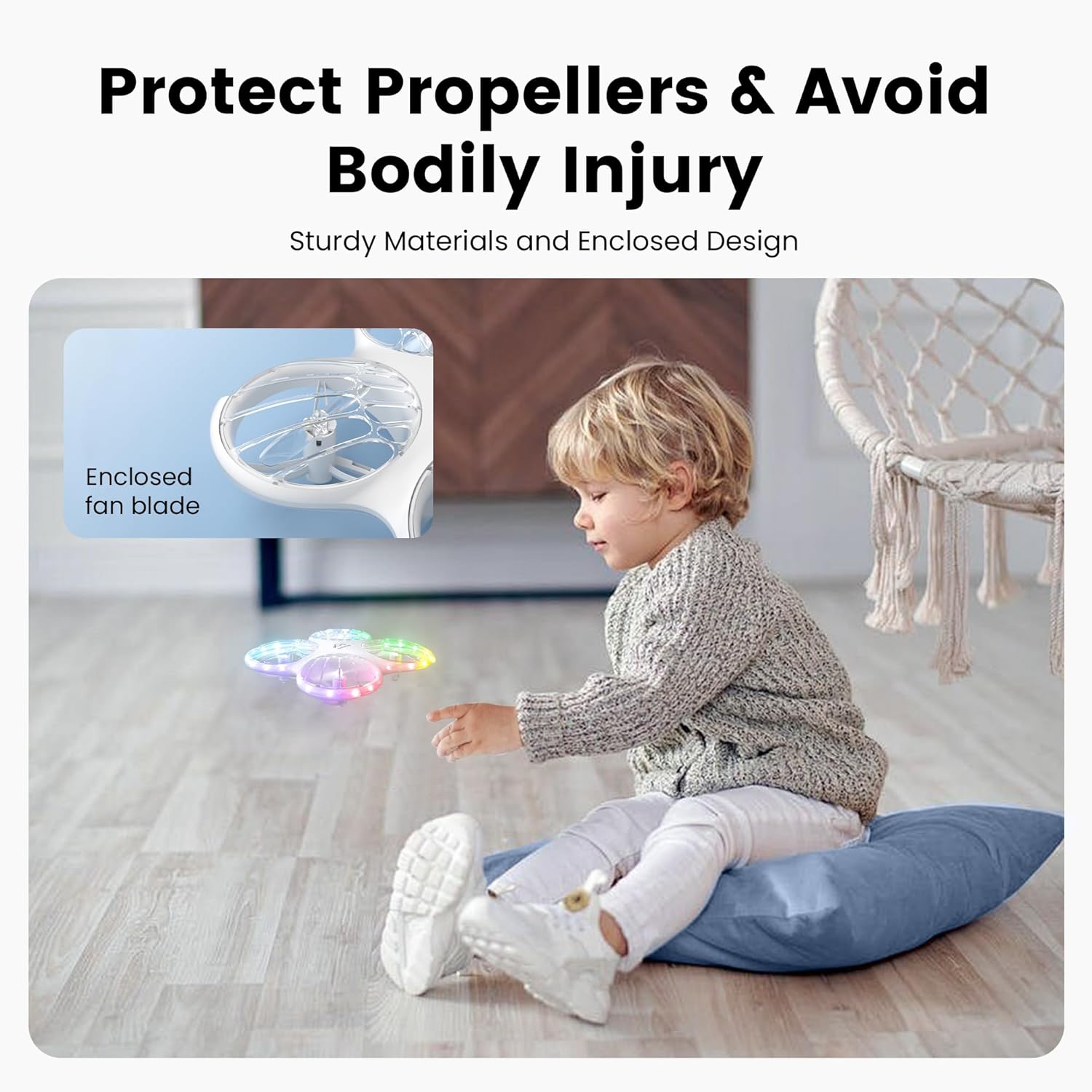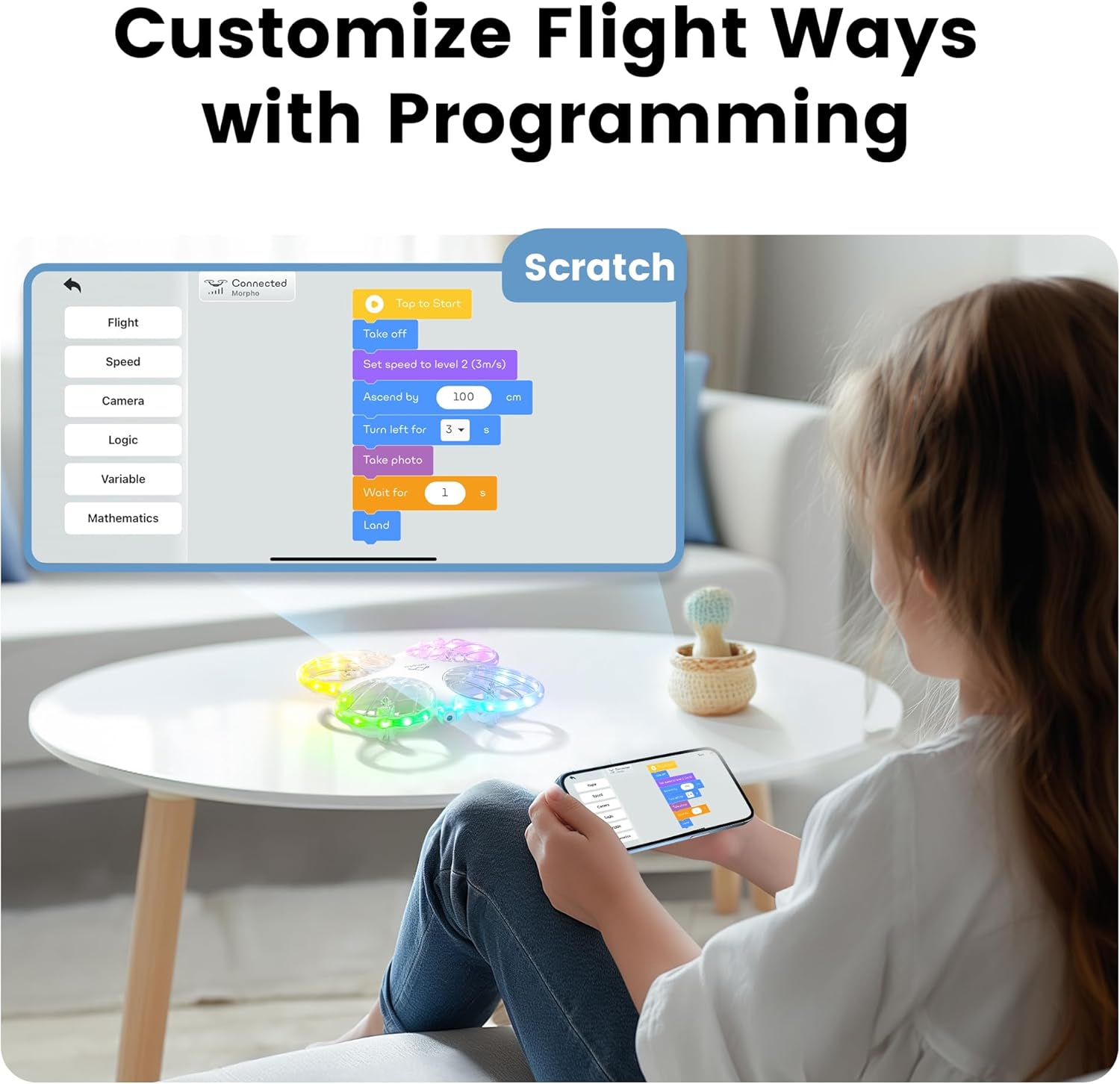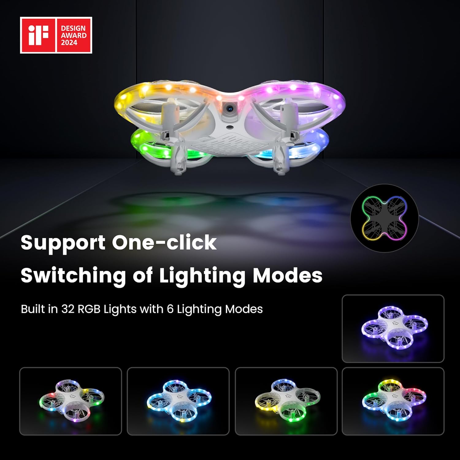 【Cool Drone with LED Lights】Morpho drone for kids comes with 32 RGB lights, providing you with powerful lighting effects and a vivid flying experience. You can change the lighting effect you like with one click on the remote control. 6 different light effects allow children to enjoy flying no matter day or night, indoors or outdoors
