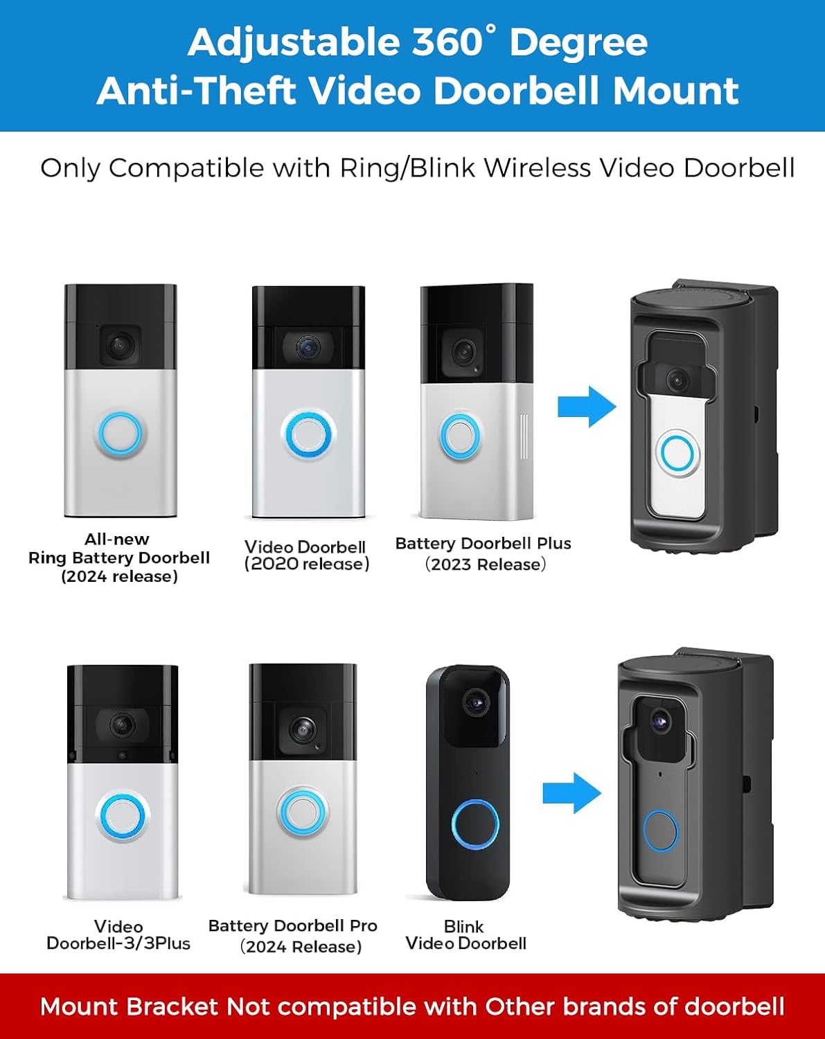 (No compatibel /WYZE Doorbell/Google Nest Doorbell )Compatible Doorbell: Adjustable Doorbell Angle Anti-Theft Video Doorbell Mount suitable for All-new Ring Battery Doorbell, Video Doorbell 2, Video Doorbell 3, Video Doorbell 3 Plus, Video Doorbell 4, Video Doorbell (2020 Release), Battery Doorbell Plus, Battery Doorbell Pro, Blink Video Doorbell Mount.(Tip: Doorbell is Not Included in Package)