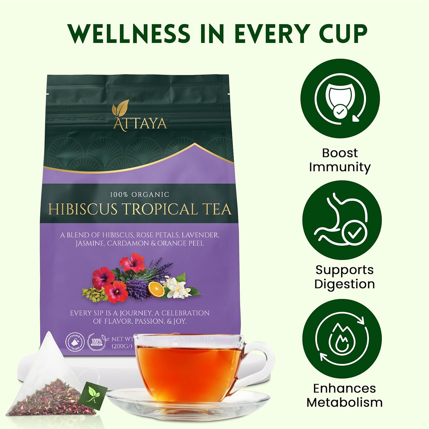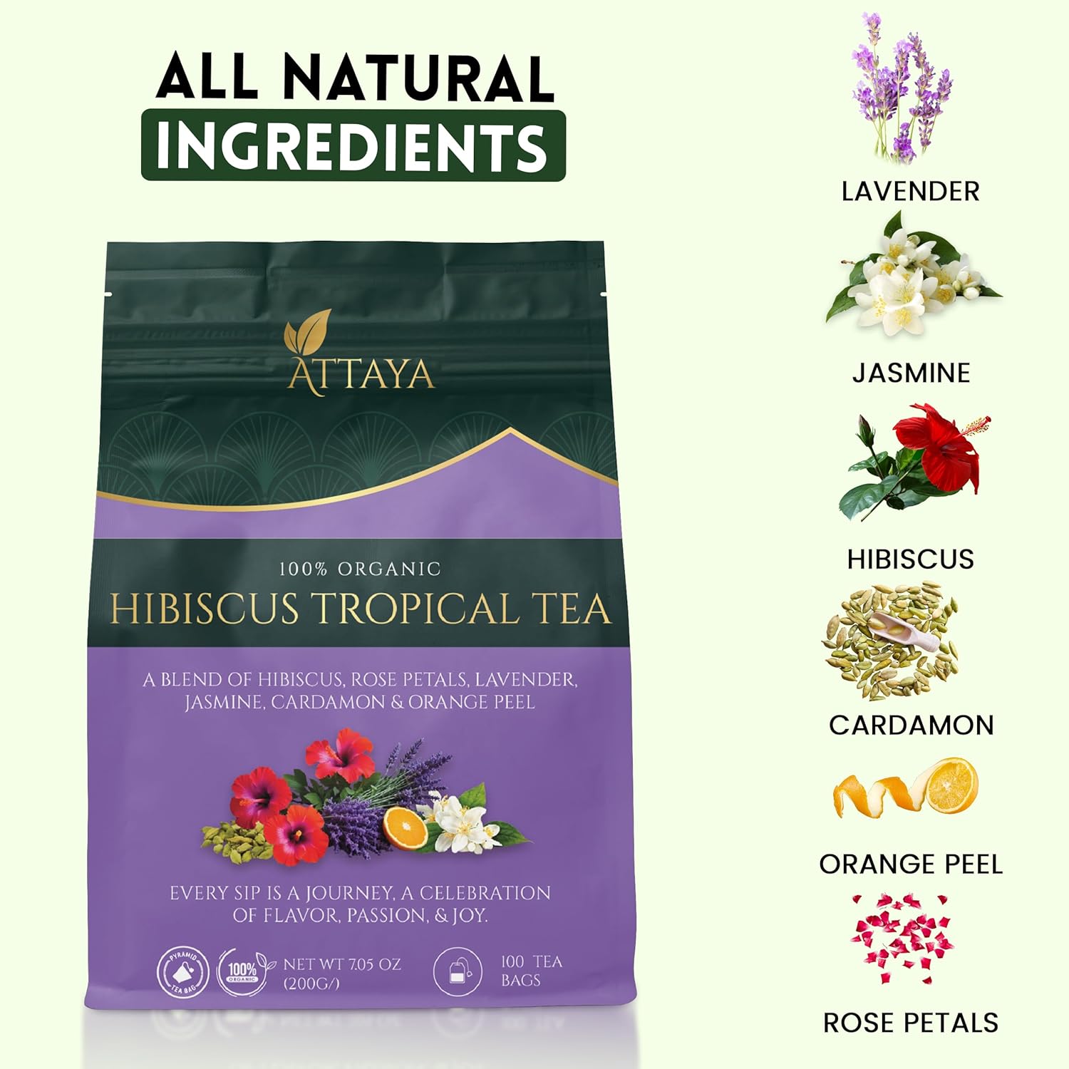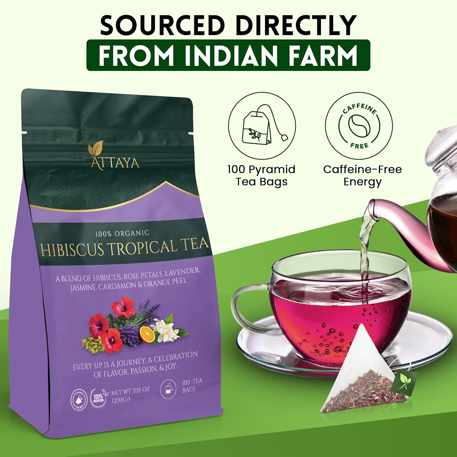 Taste the Purity: Sustainably harvested in India, this Hibiscus tropical tea is a 100% organic blend of hibiscus, rose petals, lavender, jasmine, cardamom, and orange peel. All sourced directly from Indian farms. hybiscus tea is free from artificial flavors and made with a commitment to sustainable farming practices.