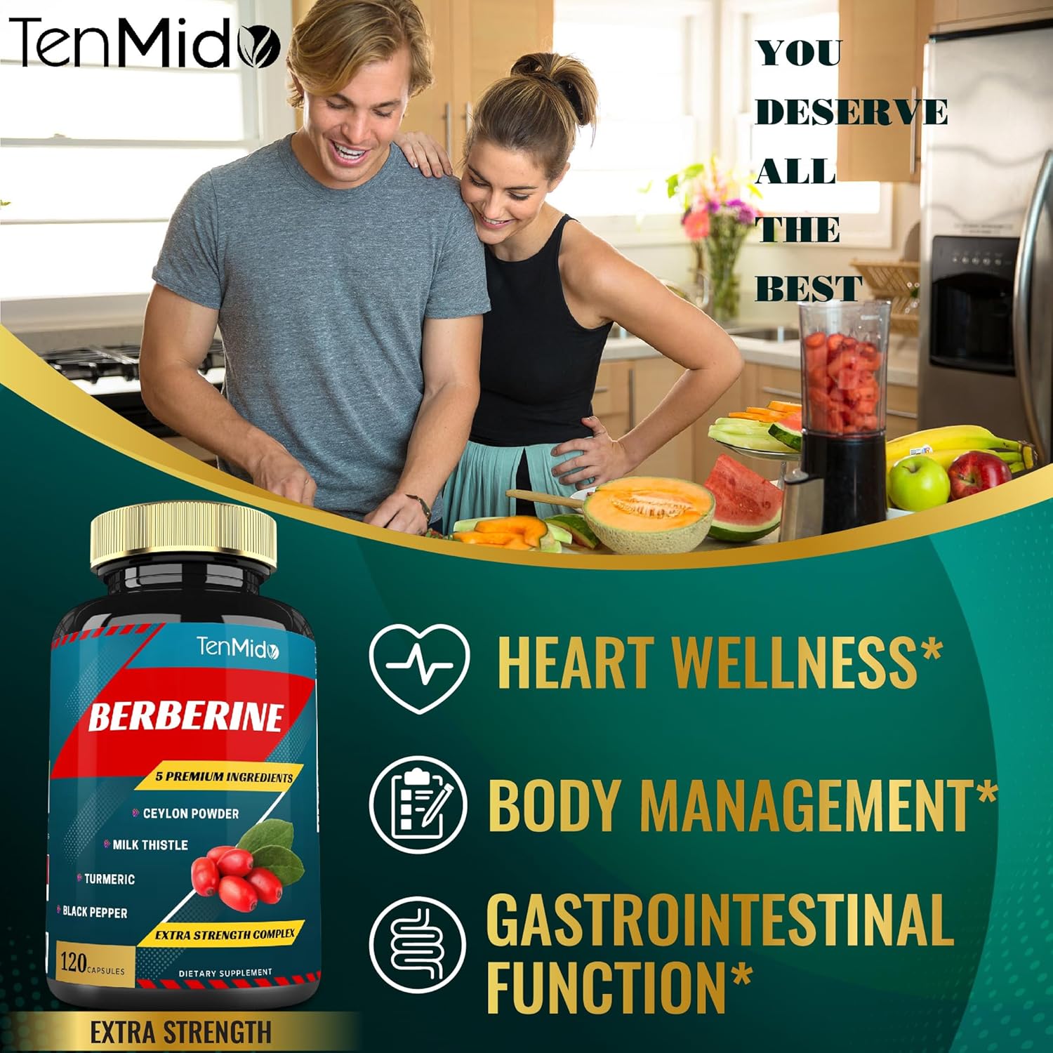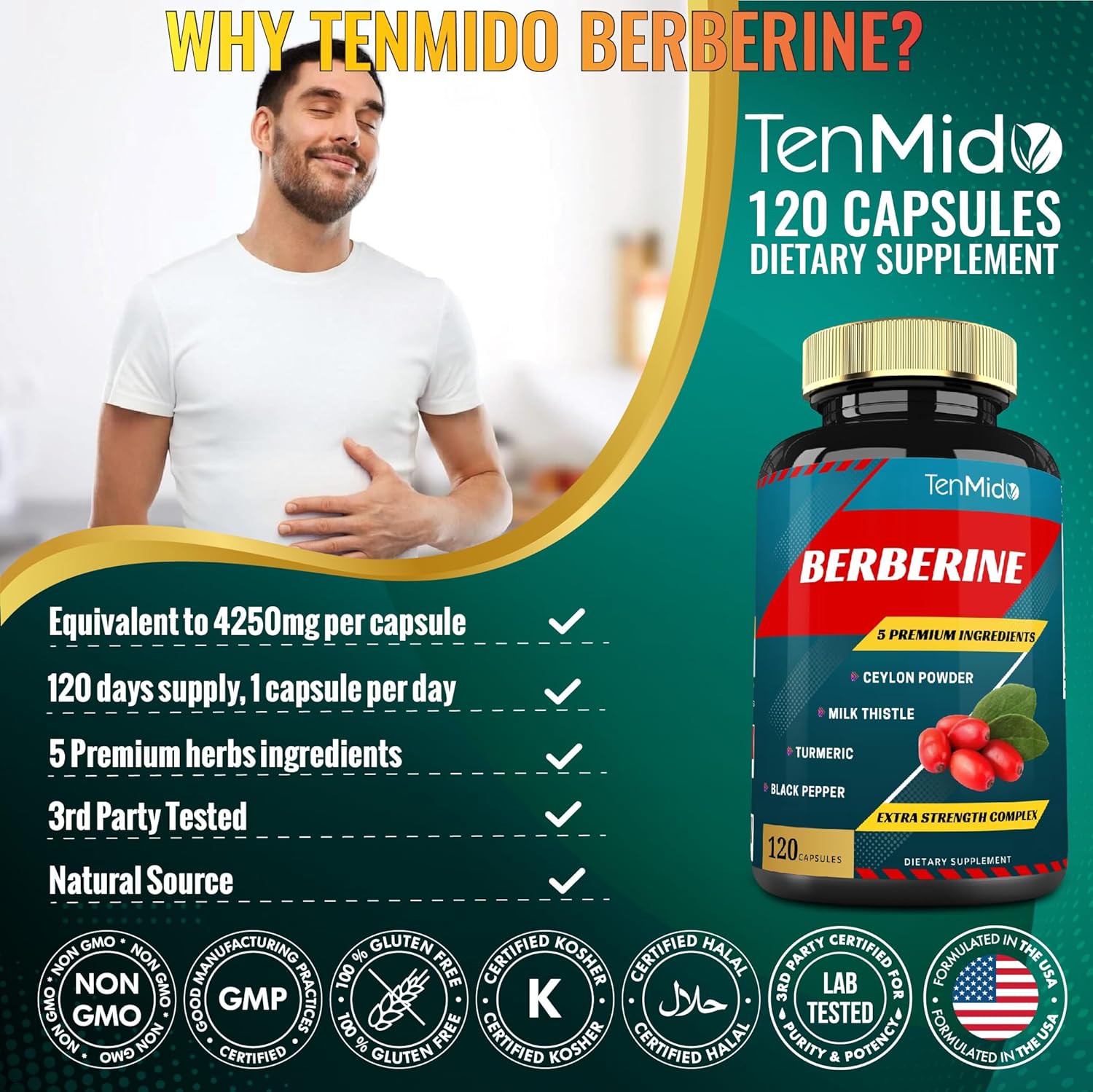 ❤️ Premium Formula: Tenmido Berberine Extract Capsules combination contain equivalent to 4250mg of the highest quality Berberine powder with 4 extra powerful herbal problematic ingredients: Ceylon, Milk Thistle, Turmeric, Black Pepper. With the special optimized formula, our product has been shown to be one of the most advantageous herbs, highest absorption for your overall health.