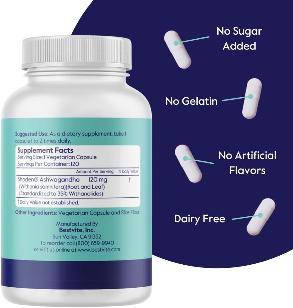 PURE FORMULA: Bestvite Advanced Ashwagandha contains no stearates, is non-GMO, gluten-free, vegan, and comes free of unwanted added ingredients. Each capsule contains 120 mg of Shoden Ashwagandha.