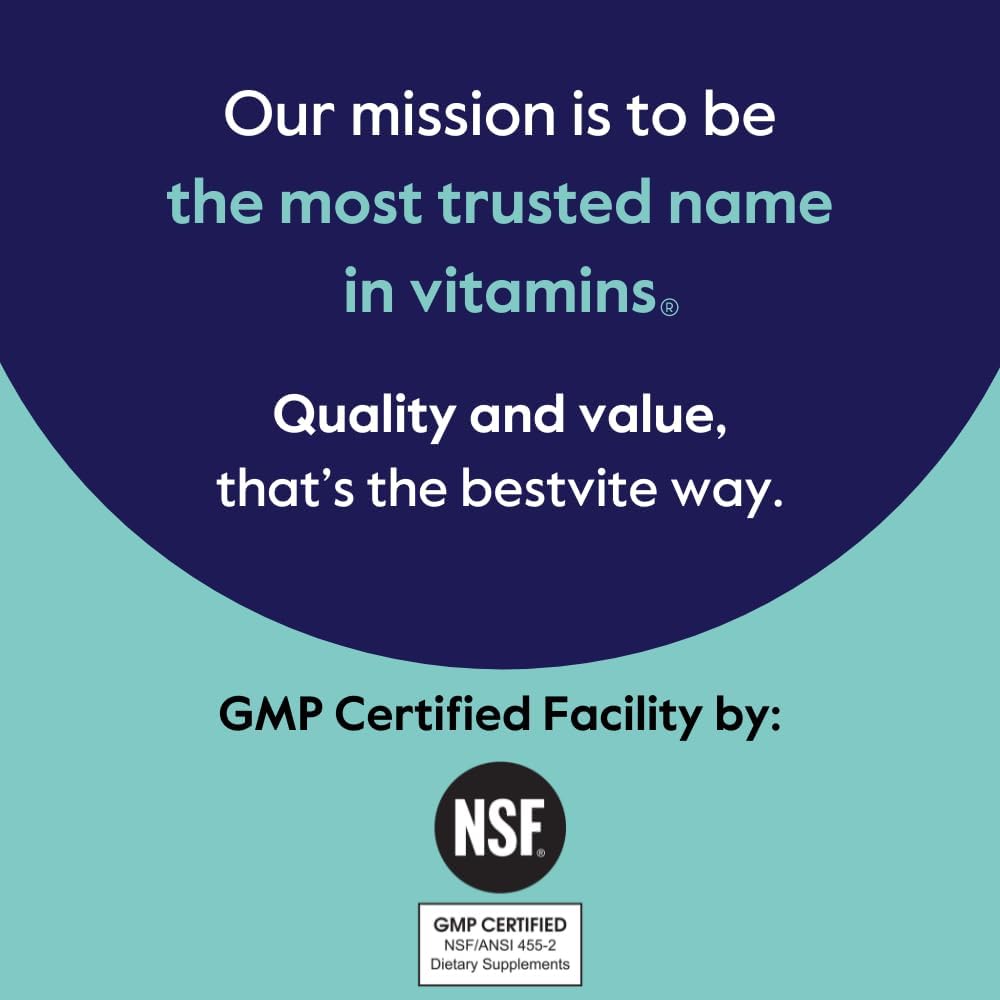 NSF GMP CERTIFIED: Bestvite’s facility is NSF/ANSI 455-2 Dietary Supplements Good Manufacturing Practice (GMP) certified. Earning GMP certification from NSF verifies that a manufacturing facility has the proper methods, equipment, facilities, and controls in place to produce dietary supplement products.