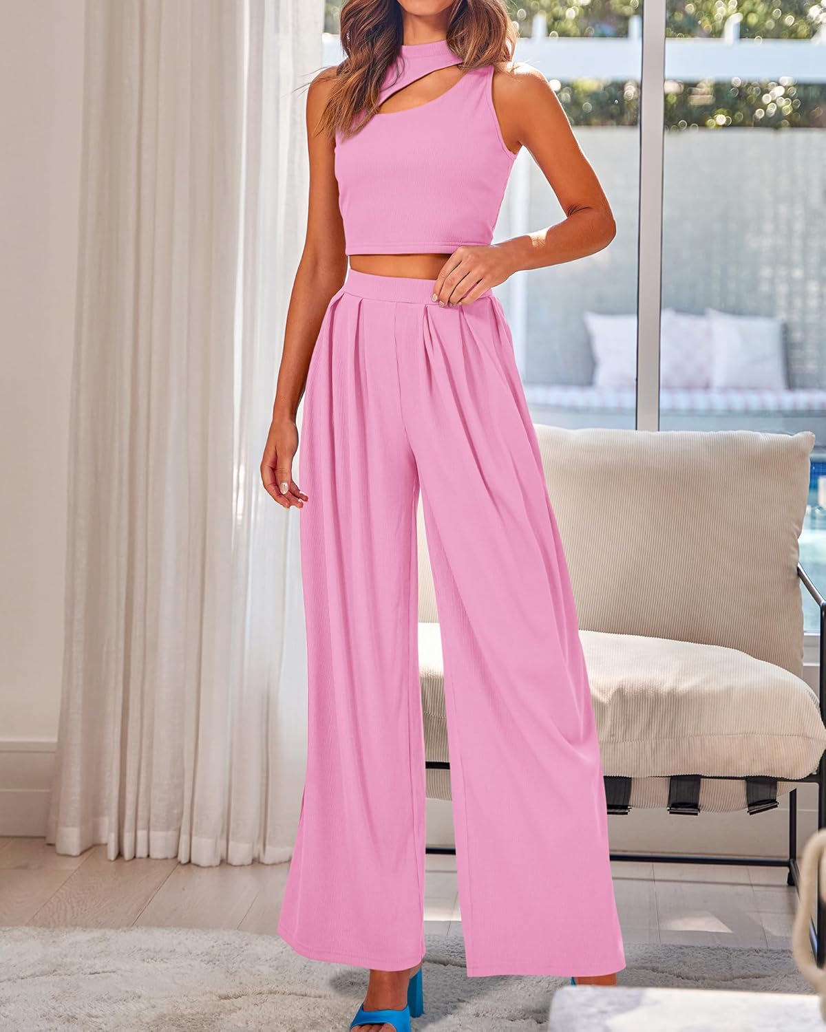 Women’s Tracksuits Ribbed Two Piece Workout OutfitCasual Sweatsuits Set Lounge Sets For Women JoggerSleeveless Cutout Crop Tops Long Palazzo Pants Set