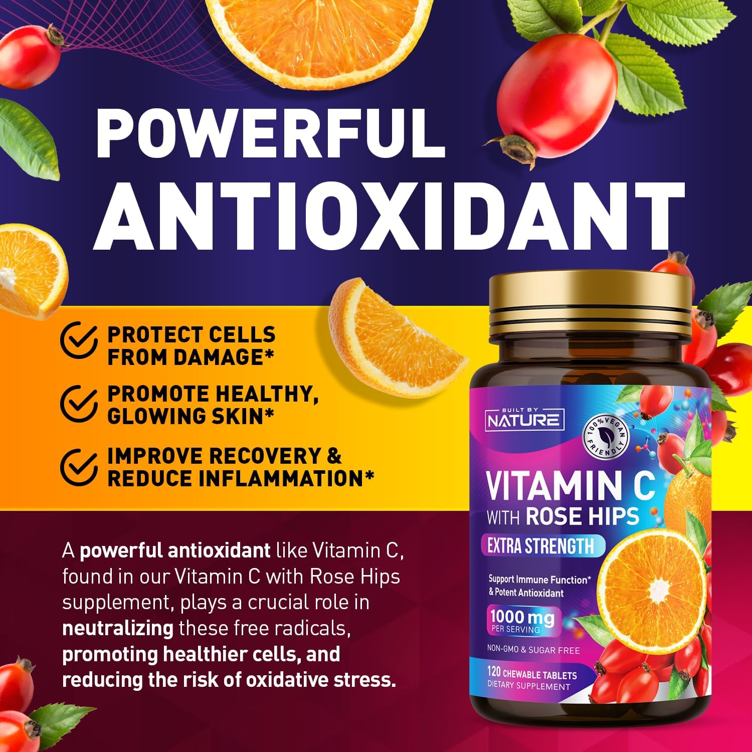 Boost your immune system with Built By Nature Chewable Vitamin C with Rose Hips. Each tablet delivers 1000mg of Vitamin C, enhanced with Rose Hips for superior antioxidant support. These chewable tablets, with a refreshing orange flavor, help maintain energy levels and promote collagen production for healthy skin. Made with Non-GMO, gluten-free, and vegan-friendly ingredients, this supplement is ideal for those who value quality and convenience. Perfect for daily use, ensuring you stay supported all year round.