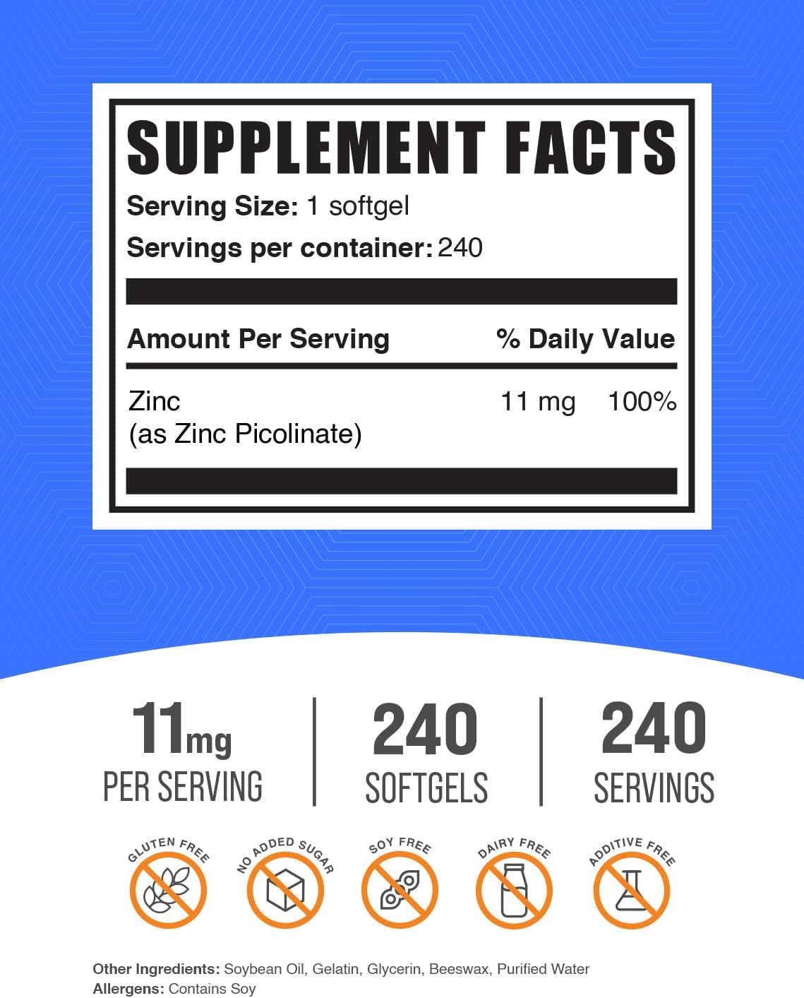 BulkSupplements.com Zinc Picolinate Softgels – Zinc Supplements, Zinc 11mg, Zinc Softgels – for Immune Support, Gluten Free – 1 Softgel per Serving, 240 Count (Pack of 1)