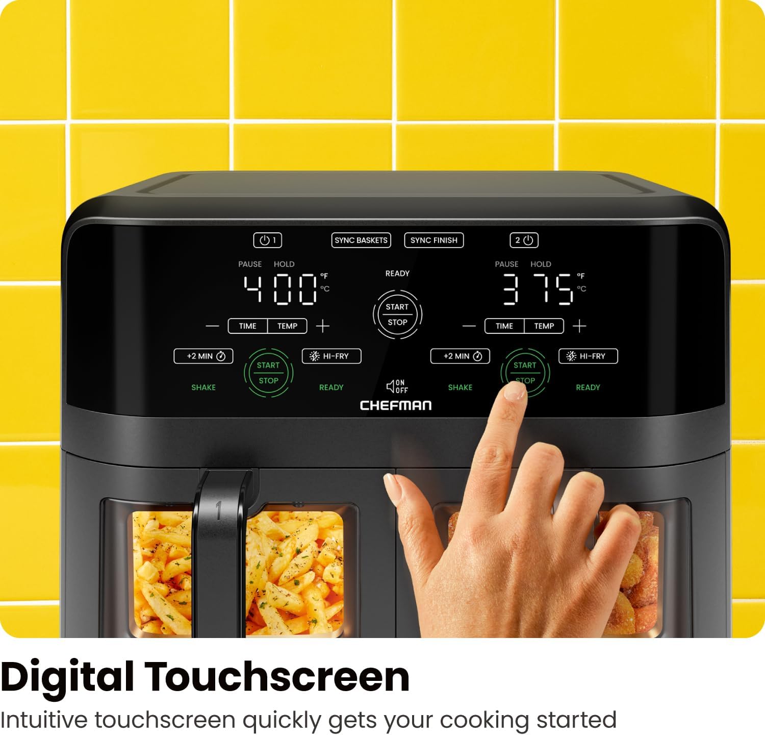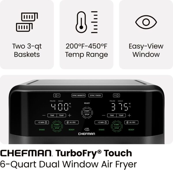 Get double the delish and make healthy meals in minutes with the Chefman TurboFry Touch Dual Window 6-Quart Air Fryer. Cook multiple foods in our 2 basket air fryer using less oil and faster than a traditional oven. The dishwasher-safe air fryer large family size double 3-quart baskets can cook a main dish and side at the same time and finish together using the Sync Finish option. With air fryer two basket cooking temperatures from 200-450°F, you can cook low and slow or get the crispiness you crave with the Hi-Fry option. Ensure evenly cooked foods with the Shake Reminder or quickly add 2 minutes of cooking with the +2 minutes button. Purchase includes a 1-year assurance from Chefman. For information on how to use your product, scroll down for a PDF User Guide. 120 Volts/1700 Watts –RJ38-SQPF-3TDB-2W