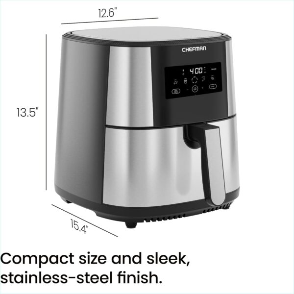 Air frying for the family is so convenient with the Chefman TurboFry® Touch 8-Quart Air Fryer. With effortless one-touch digital controls and four built-in presets, you can cook your favorite foods to the perfect fried finish every time. An adjustable temperature range of 200-400°F gives you complete control, while an automatic shake reminder ensures even cooking. The dishwasher-safe nonstick 8qt basket capacity allows you to feed the whole family, and the stainless-steel exterior wipes down simply with a damp cloth. Purchase includes a 1-year assurance from Chefman. For information on how to use your product, scroll down for a PDF User Guide. 120 Volts/1700 Watts –RJ38-SQSS-8T