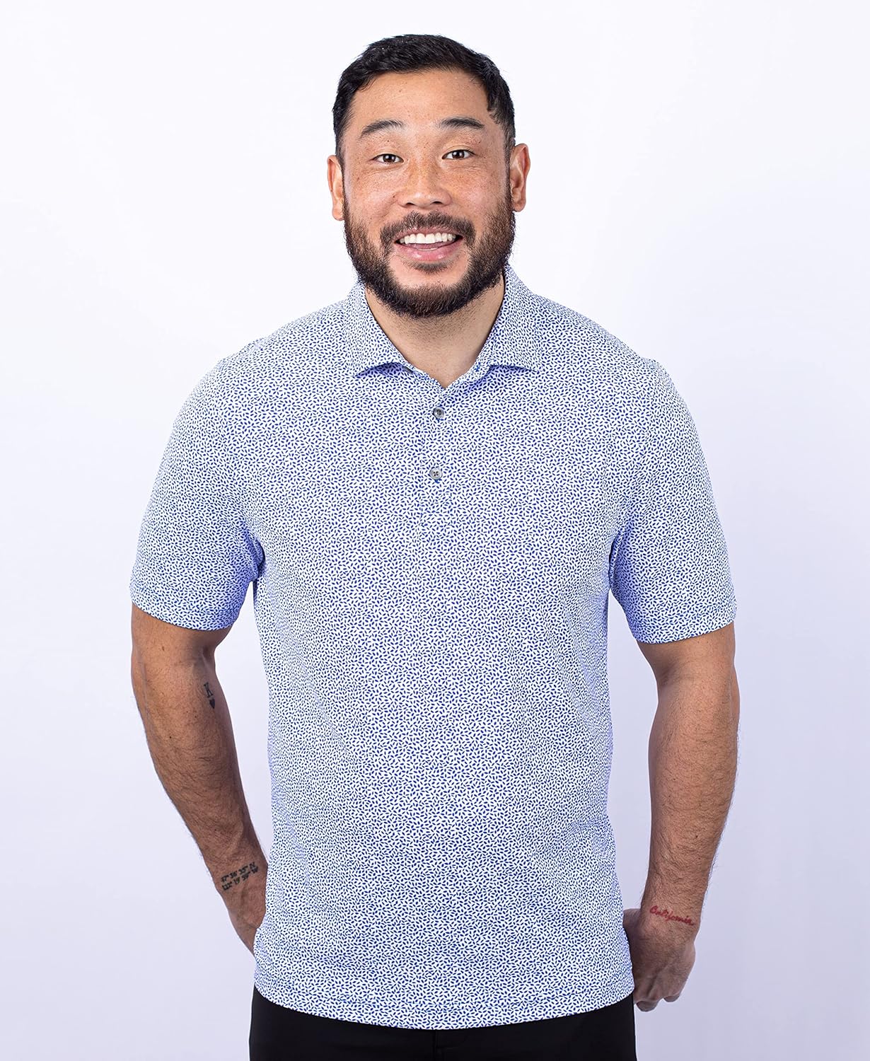 The iconic Virtue Eco Pique Botanical Print Polo is engineered for exceptional versatility, designed as your favorite sustainable mens print polo shirt for golf, the office, WFH, travel, recharging, and for a night out. Ultra-lightweight, high quality, certified eco-friendly recycled drytec polyester is blended with spandex for stretch, a cooling effect, and UPF sun protection, resulting in the most versatile, sustainable, and comfortable print polo for you and the planet.