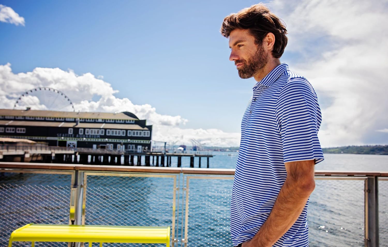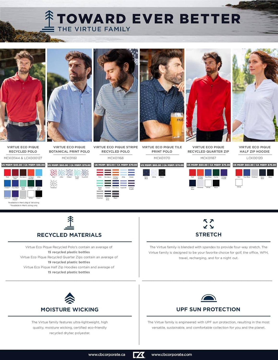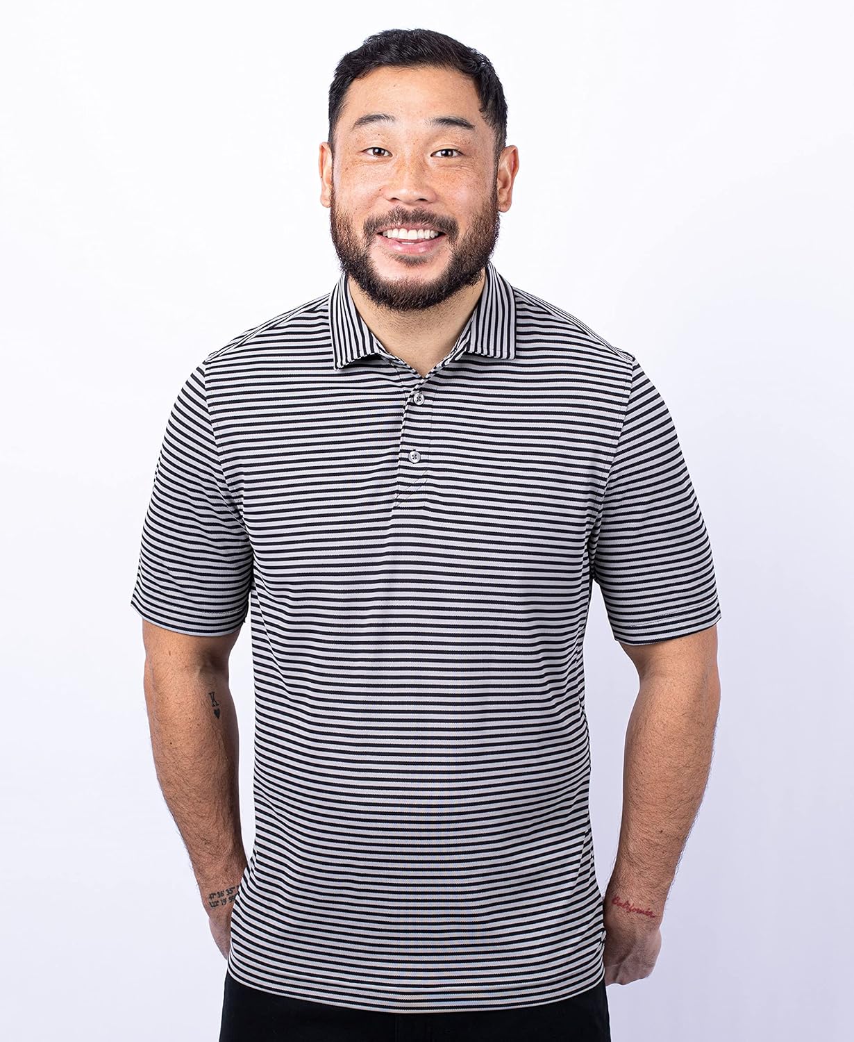 The iconic Virtue Eco Pique Stripe is engineered for exceptional versatility, designed to be your favorite sustainable mens big and tall striped polo shirt for golf, the office, WFH, travel, recharging, and for a night out. High quality certified eco-friendly recycled polyester is blended with drytec polyester and spandex for stretch, a cooling effect, and UPF sun protection, resulting in a versatile, sustainable, and comfortable striped polo for you and the planet.