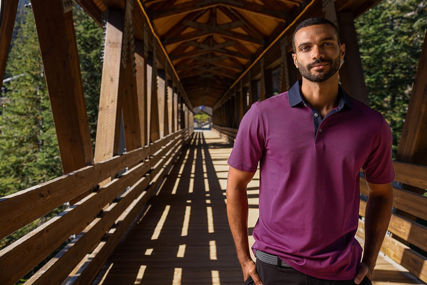 The iconic Virtue Eco Pique Micro Stripe Mens Polo is engineered for exceptional versatility, designed as your favorite sustainable mens quarter zip for golf, the office, WFH, travel, recharging, and for a night out. Ultra-lightweight, high quality, certified eco-friendly recycled drytec polyester is blended with spandex for stretch, a cooling effect, and UPF sun protection, resulting in the most versatile, sustainable, and comfortable stripe polo for you and the planet.