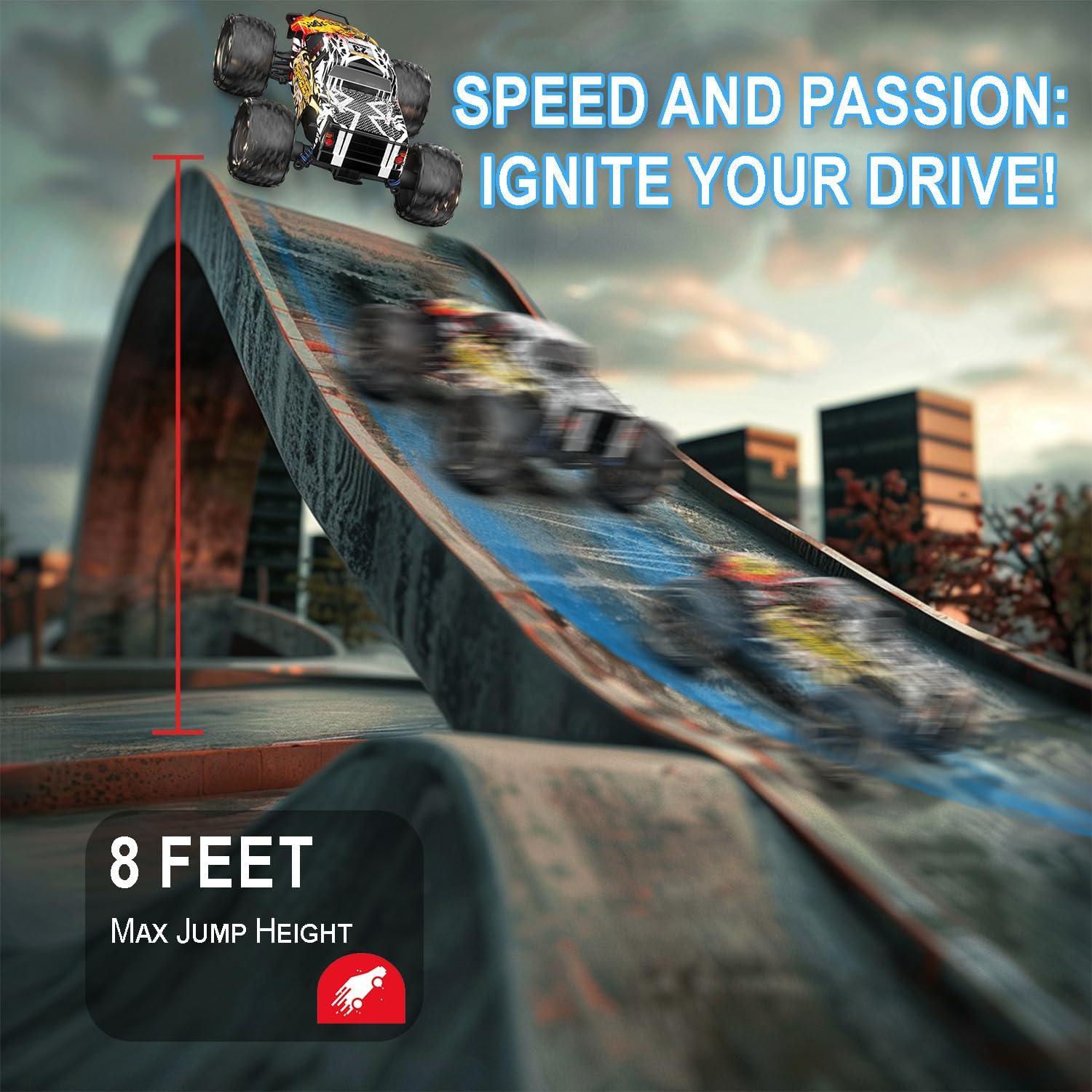 Moter with Professional Metal Heat Sink: The monster truck is equipped with a 380 motor that can perform 21500 revs per minute, which made a huge enhancement for the acceleration and allows the RC car to have a top speed of 40+ km/h. There is a metal heat sink that fully covers the motor to enhance motor heat dissipation so as to extend motor life. Please note that the motor gets heated when the truck has been driven for a long time. We recommend you pause intermittently after 15 mins driving.