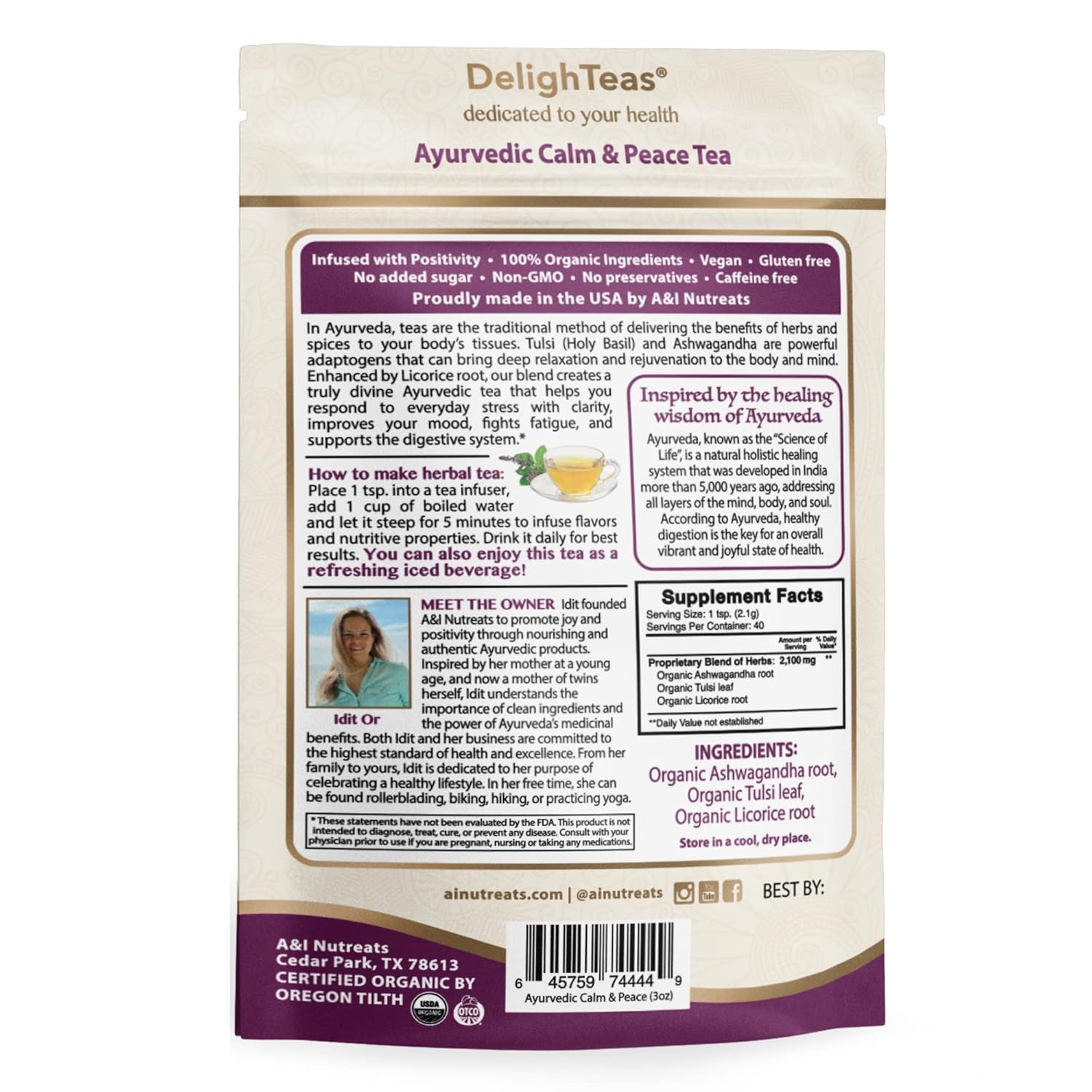 DelighTeas Organic Calm & Peace Tulsi Holy Basil Tea | Ayurvedic Loose Leaf Tulsi, Ashwagandha and Licorice Tea | Adaptogen Blend | USDA Organic, Non-GMO, Caffeine Free, Sugar Free | 40 Servings, 3 oz