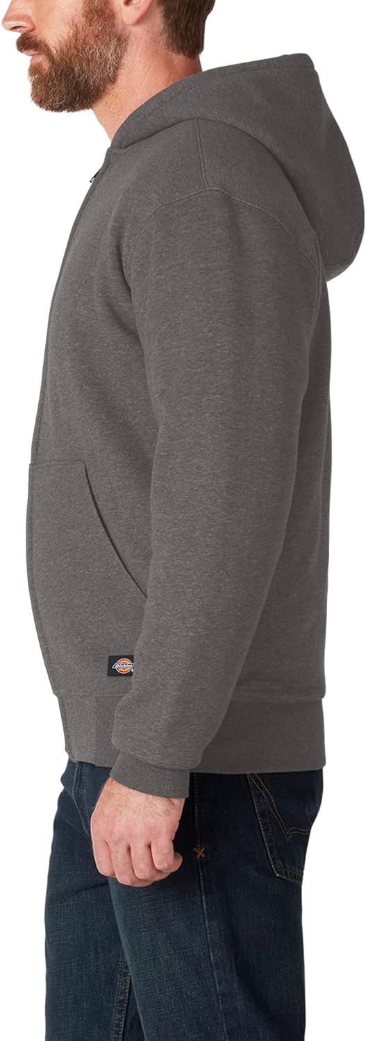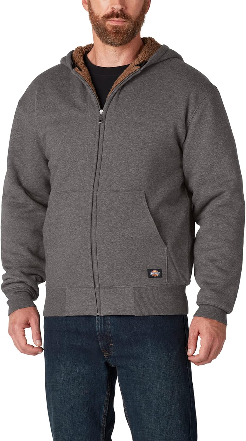 A classic work layer meets revolutionized technology to create the ultimate weather-ready hoodie that stands up to tough working conditions. Dickies Sherpa Lined Full Zip Fleece Hoodie is equipped with a Durable Water Repellent (DWR) finish to keep you dry and ready to perform. The comfortable construction provides extra warmth through the Sherpa fleece lining and hand warmer pockets at front. A patented SafeCinch™ internal mechanism adds the benefit of adjusting the drawcords through the interior of the front pockets, allowing your hands to stay protected and preventing you from getting caught up as you navigate the most protective cinched fit. Complete with a durable front metal zipper and three-piece hood for a better fit, this hardworking hoodie is ready to hit harsh weather head on.