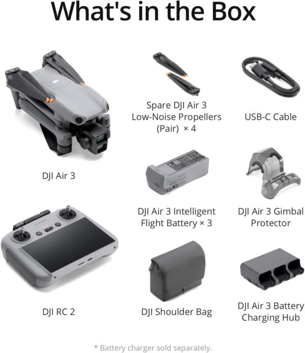 -DJI Air 3 Fly More Combo (DJI RC 2) includes the drone, three Intelligent Flight Batteries, a Battery Charging Hub, and more, as well as the new DJI RC 2, which offers a bright touchscreen and the DJI Fly app pre-installed for an exceptional operating experience.