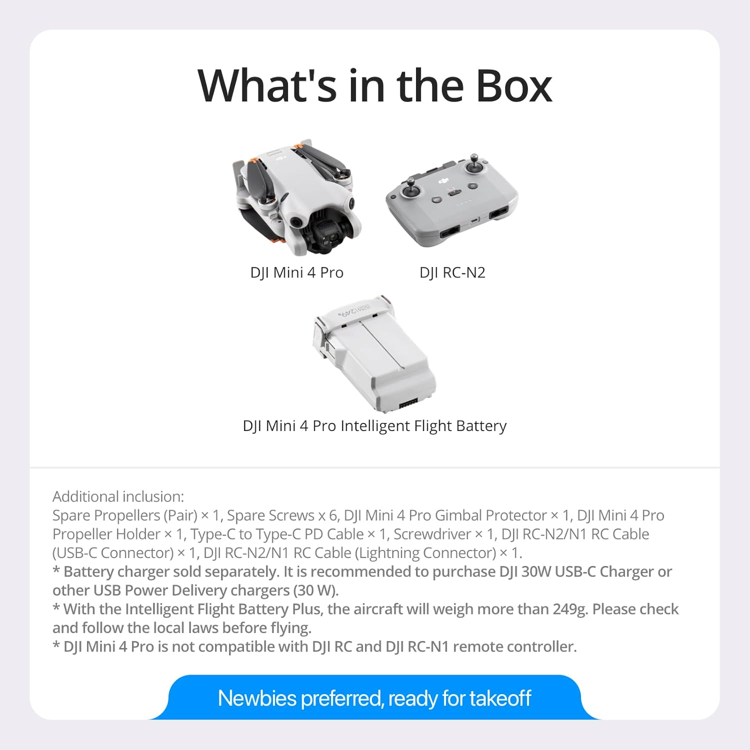 -DJI Mini 4 Pro (DJI RC-N2) includes the drone, DJI RC-N2 remote controller, and more. A great choice for beginners.
