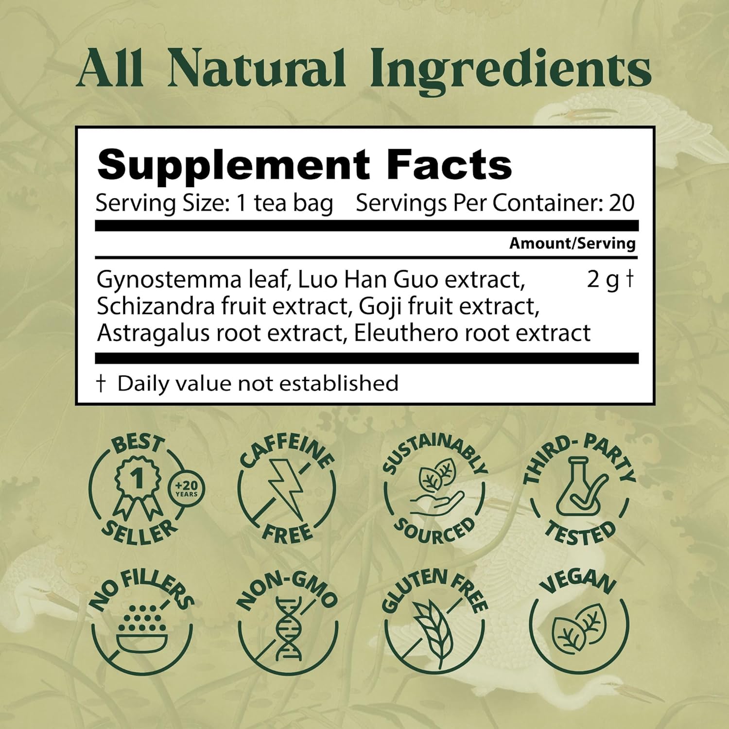 Dragon Herbs Spring Dragon Longevity Tea – Adaptogenic Gynostemma Leaf Herbal Tea Infused with Schizandra Berry, Goji Berry, Astragalus Root, Eleuthero Root, Luo Han Guo Fruit – Immune Support, Calming, Invigorating, Energy, Soothing, Digestion Support, Caffeine Free – 20 Individually Wrapped Tea Bags, Makes 60 servings of Tea