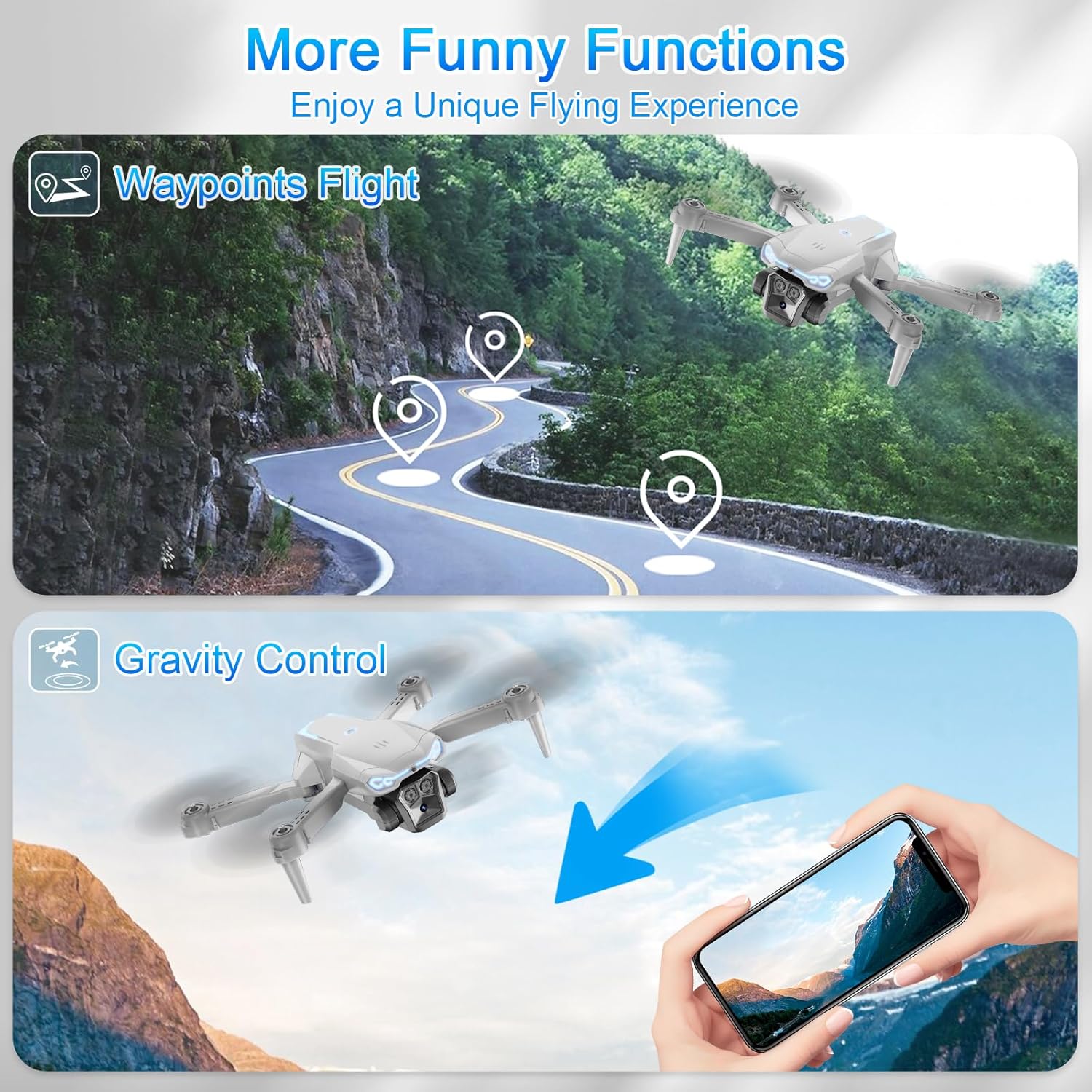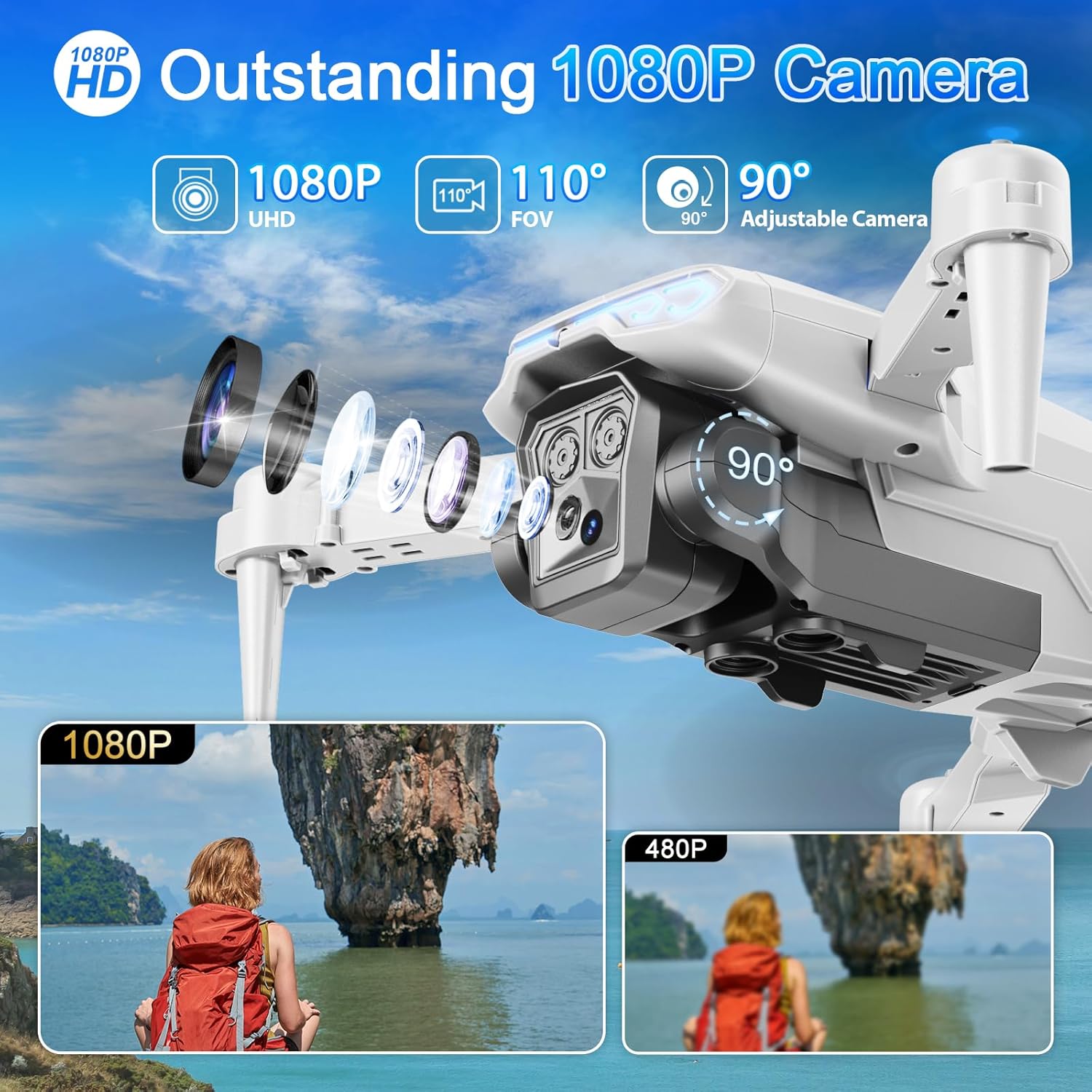 1080P HD camera: The drone is equipped with a 90° adjustable lens, 1080P HD WIFI camera and FPV transmission, allowing you to seamlessly view live footage from the drone in the air on your phone.