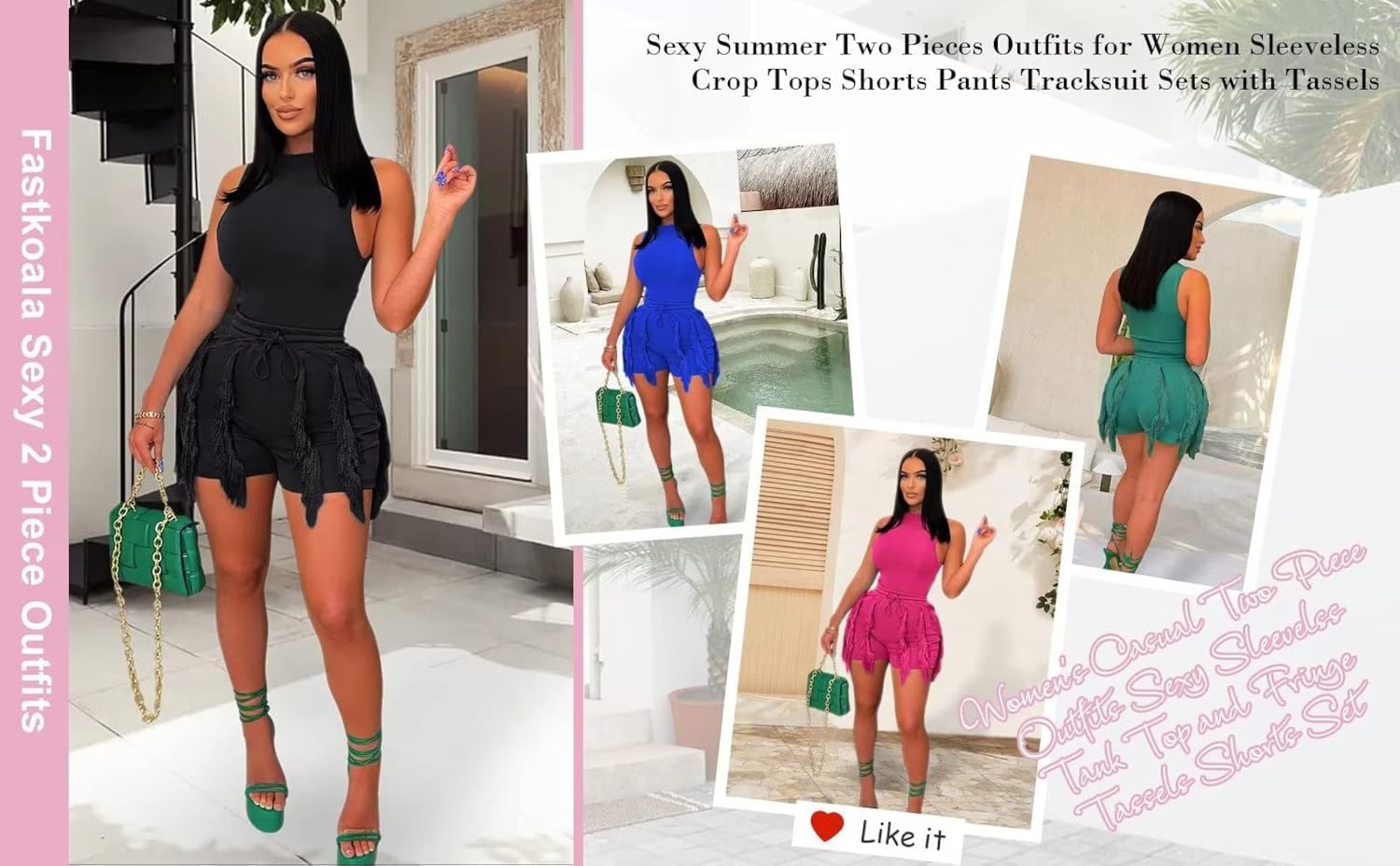 Brand: FastkoalaFastkoala Women’s Two Piece Outfits – Summer Casual Sleeveless Tracksuits Sets Sexy Crop Tops Shorts Sweatsuits with TasselsSimple, Casual and fashionable! Stylish Sexy Summer Vacation Outfits for Women 2Pieces Shorts Set will be the center of every occasion, exceptional stretch and comfy fit. Show off your feminine side and sexy figure in this classy fashion outfits to draw people’s attention.Style: Fashion/Sweet/Cute/Casual/Stylish/sexy for any Occasion.Material:Womens Summer Casual Two Pieces Outfits Tracksuit Sweatsuits Made of Spandex & Polyester, Strethcy Fabric, It is Breathable, Soft, Comfy and Skin-friengly, Which Make it Light and Ideal for Daily Lounge Streetwear.Occasion:Sexy Summer Two Piece Outfits Short Loungewear Clubwears Set,2 Piece Outfits Crop Tank top with Fringe Tassel Short pants suits for daily casual, streetwear, outdoor, leisure time, date ,jogging, vacation,birthday, party club, night out, yoga, active lounge wear, biker,fitness, work, office, etc.All Matching:Sets for women clothing Suitable for matching it with cardigans,hats,hand bags,sneakers,boots,sandals,heels and flats.SIZE CHART(inch):Please check the SIZE CHART carefully before you purchase.S: Bust: 30.71 inch Hip: 33.07 inch Clothing Length: 19.92 inch Waist: 24.41 inch Pants Length: 12.99 inchM: Bust:32.28 inch Hip: 34.65 inch Clothing Length: 20.31 inch Waist: 25.98 inch Pants Length: 13.39 inchL: Bust: 33.86 inch Hip: 36.22 inch Clothing Length: 20.51 inch Waist: 27.56 inch Pants Length: 13.78 inchXL: Bust: 35.43 inch Hip: 37.80 inch Clothing Length: 20.90 inch Waist: 29.13 inch Pants Length: 14.17 inchXXL: Bust: 37.01 inch Hip: 39.97 inch Clothing Length: 21.30 inch Waist: 32.28 inch Pants Length: 14.57 inch