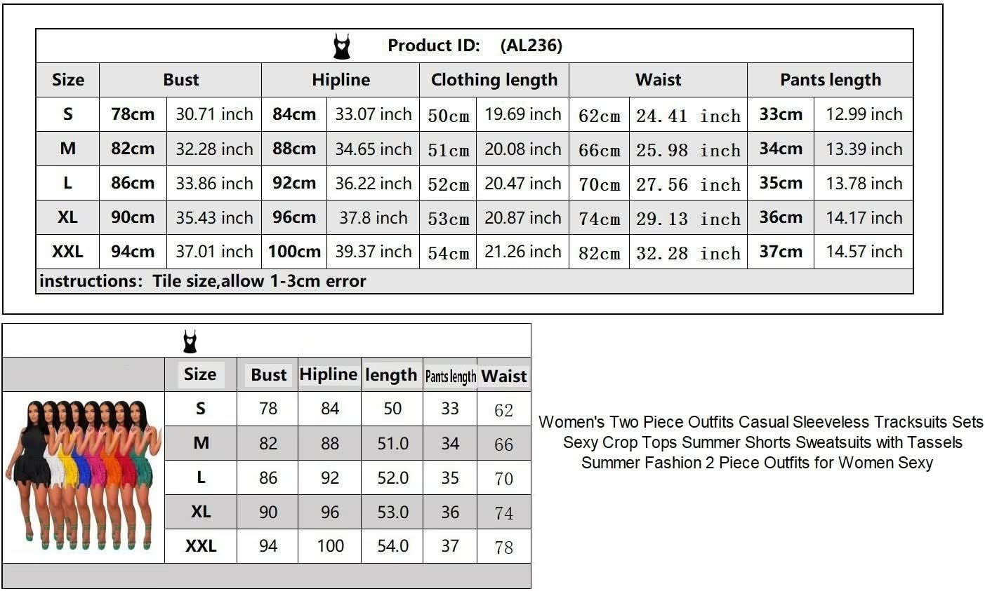 Style: Fashion/Sweet/Cute/Casual/Stylish/sexy for any Occasion.Material:Womens Summer Casual Two Pieces Outfits Tracksuit Sweatsuits Made of Spandex & Polyester, Strethcy Fabric, It is Breathable, Soft, Comfy and Skin-friengly, Which Make it Light and Ideal for Daily Lounge Streetwear.Occasion:Sexy Summer Two Piece Outfits Short Loungewear Clubwears Set,2 Piece Outfits Crop Tank top with Fringe Tassel Short pants suits for daily casual, streetwear, outdoor, leisure time, date ,jogging, vacation,birthday, party club, night out, yoga, active lounge wear, biker,fitness, work, office, etc.All Matching:Sets for women clothing Suitable for matching it with cardigans,hats,hand bags,sneakers,boots,sandals,heels and flats.SIZE CHART(inch):Please check the SIZE CHART carefully before you purchase.S: Bust: 30.71 inch Hip: 33.07 inch Clothing Length: 19.92 inch Waist: 24.41 inch Pants Length: 12.99 inchM: Bust:32.28 inch Hip: 34.65 inch Clothing Length: 20.31 inch Waist: 25.98 inch Pants Length: 13.39 inchL: Bust: 33.86 inch Hip: 36.22 inch Clothing Length: 20.51 inch Waist: 27.56 inch Pants Length: 13.78 inchXL: Bust: 35.43 inch Hip: 37.80 inch Clothing Length: 20.90 inch Waist: 29.13 inch Pants Length: 14.17 inchXXL: Bust: 37.01 inch Hip: 39.97 inch Clothing Length: 21.30 inch Waist: 32.28 inch Pants Length: 14.57 inch