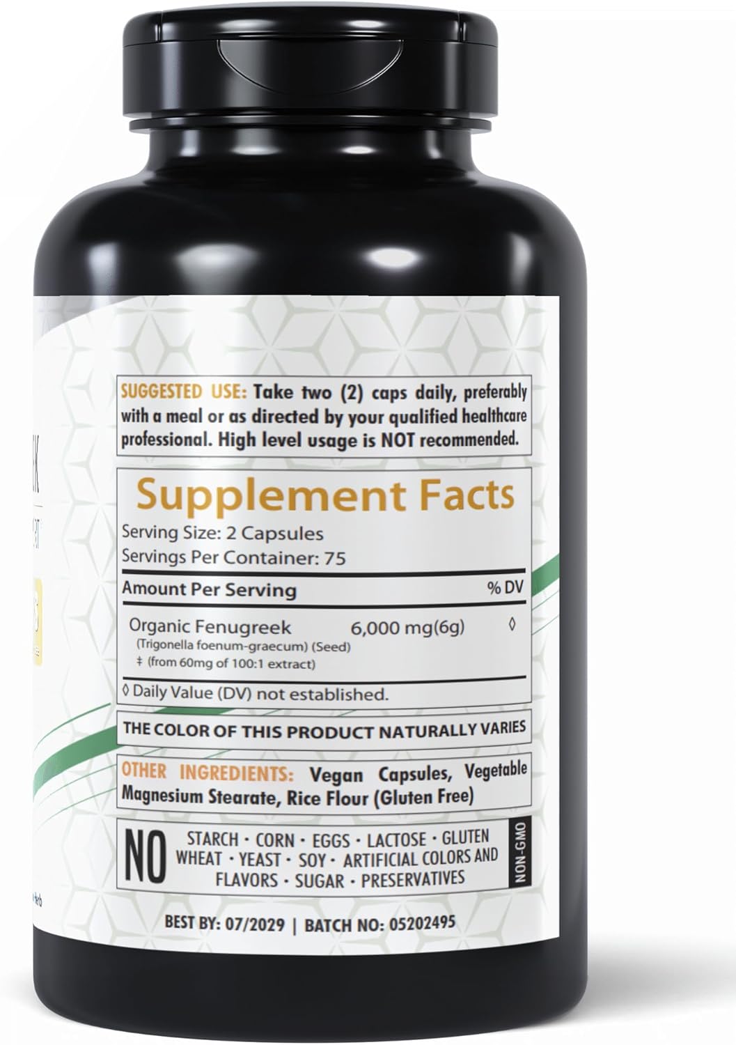 UNIQUE DEAL: Our concentrated Fenugreek capsules offer 6000 MG per capsule with 150 capsules per bottle. Enjoy superior value compared to other brands with fewer capsules and lower potency. Each bottle provides an ample supply to support your wellness journey.