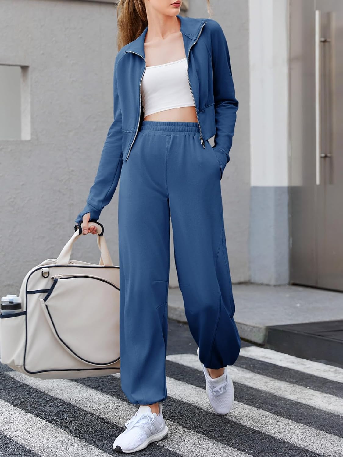 The cropped sweatshirt offers a modern twist to a classic silhouette, while the high-waisted pants provide a flattering fit that accentuates your waist.