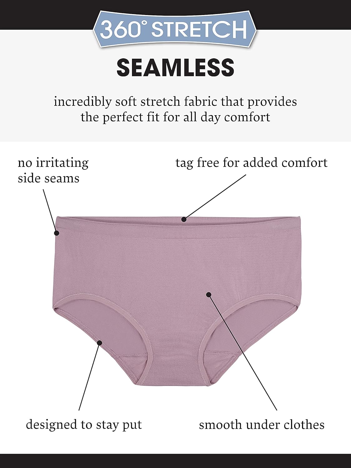Color and Style May Vary (Assorted). Pesky panty lines and irritating side seams are a thing of the past with Fruit of the Loom’s Seamless hi-cuts! Made with 100% premium nylon, these panties have an amazing stretch that moves with you and fits perfectly to your shape. Flat ribbon elastic lays flat against your skin to eliminate panty lines and irritation from side seams. The waistband is smooth and comfortable, and as always, Fruit of the Loom panties are tag free for extra softness. The hi-cut silhouette sits above the hips and has leg openings cut higher towards the hips. These wardrobe essentials are perfect for everyday wear or special occassions and are sure to become your new go-to! Stock up on these must-haves with our convenient 6 pack!