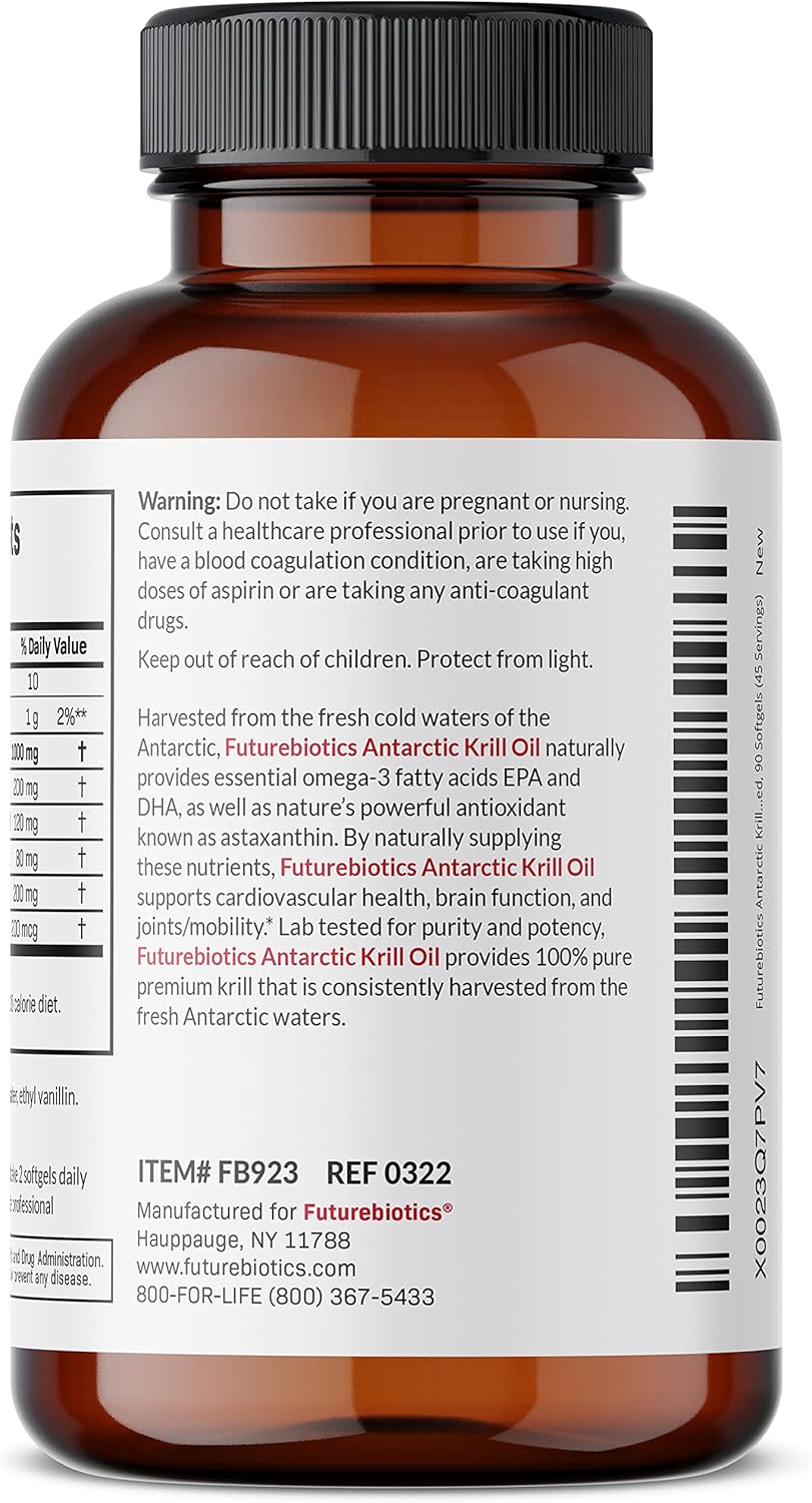 Consistently harvested from the cold Antarctic waters, Futurebiotics Antarctic Krill Oil naturally provides essential Omega-3 fatty acids EPA/DHA, Astaxanthin, Phospholipids, and a potent 1000 MG of premium Krill Oil per serving. By naturally providing these nutrients, Futurebiotics Antarctic Krill Oil 1000 MG helps to support overall good health and well-being.* Futurebiotics Krill Oil is consistently verified every batch for quality and final product potency. Laboratory tested for Heavy Metals, Non-GMO, Gluten-Free and Soy-Free in our state-of-the-art cGMP registered facility in New York.