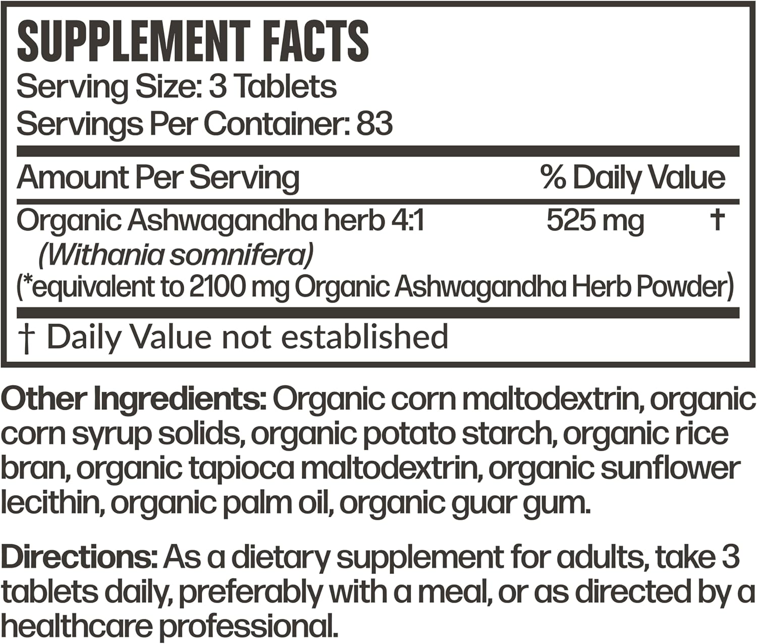 Organic Stress Support Formula*: Ashwagandha is known as an Adaptogenic herb, as it helps the body cope and adapt to various stresses that occur in daily life. Futurebiotics Organic Ashwagandha provides equivalent to 2100mg (from 525mg of 4:1 extract) per serving (3 Organic Tablets) of high-quality Ashwagandha herb.