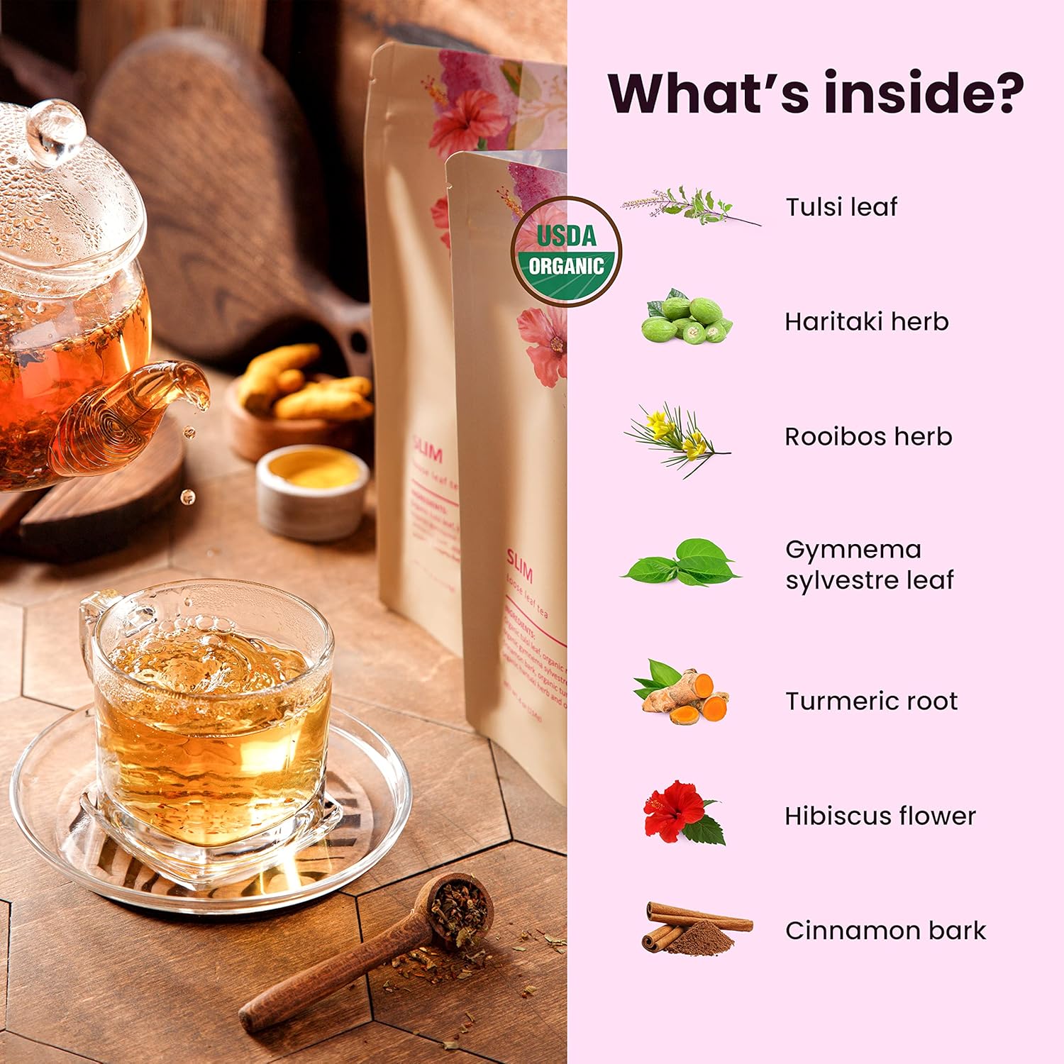 INGREDIENTS: Organic tulsi leaf, organic rooibos herb, organic gymnema sylvestre leaf, organic cinnamon bark, organic turmeric root, organic haritaki herb, organic hibiscus flower