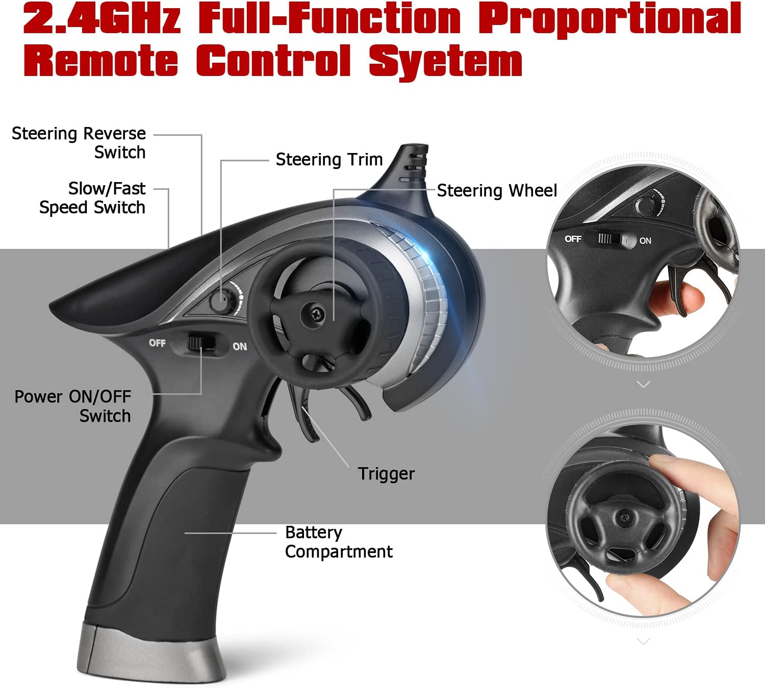 【Full-Function Radio System】This Off road truck employs an enhanced version powerful 380 brush motor which powers a top speed up to 36km/H. Full-function proportional 2.4GHz radio control reflects a 280-feet-control range, forward/brake/backward, with no signal inference when the fast rc car is raced with your friends. What is more, Normal/slow speed switch is specified for beginners and children to pick up.