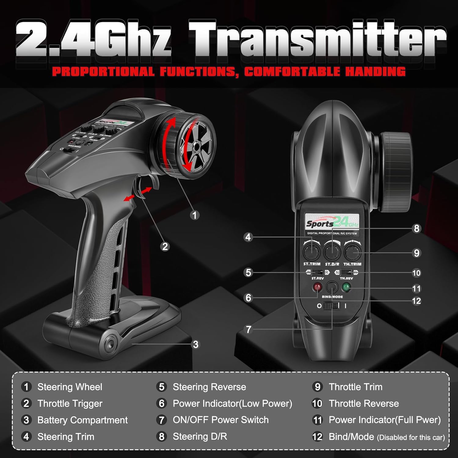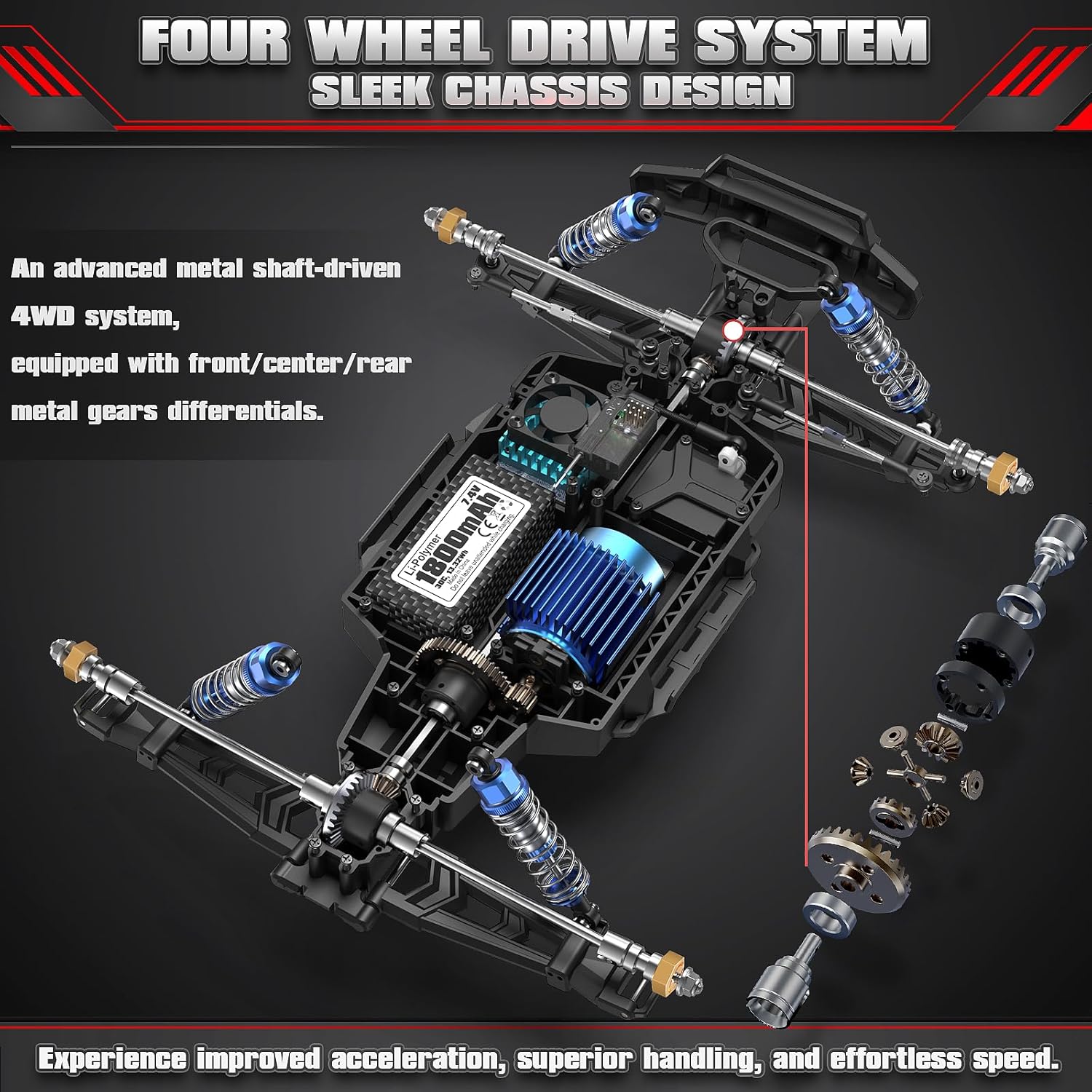 【Experience Thrilling Speeds】 : Powered by the 3800KV 3650 brushless motor and the 2S 1800mAh Li-Po battery, this remote control car provides an exciting driving experience and allows speeds up to 30mph (52km/h) . Equipping this fast rc car with a 3S battery will propel it to speeds of over 45mph (72km/h). Enjoy thrilling acceleration and fast speeds on various terrains.