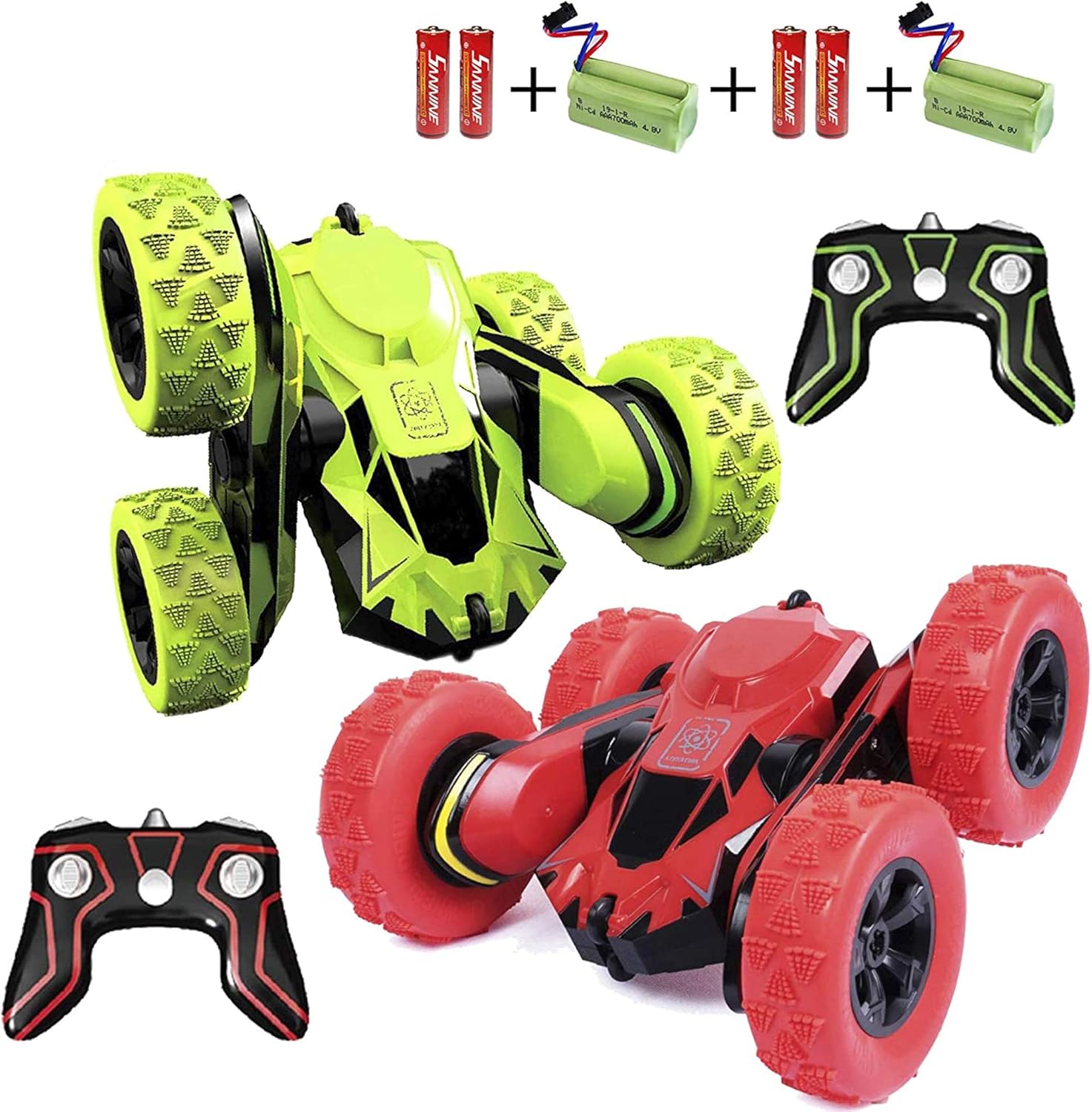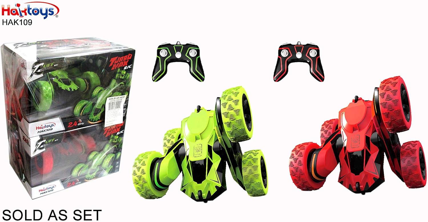 Package Contents 1 x Green RC Stunt Car 1 x Red RC Stunt Car 2 x Rechargeable Battery (One for each car) 2 x 2.4GHz Remote Control 4 x AA size 1.5V Battery for the Controller 2 x USB Fast Charger