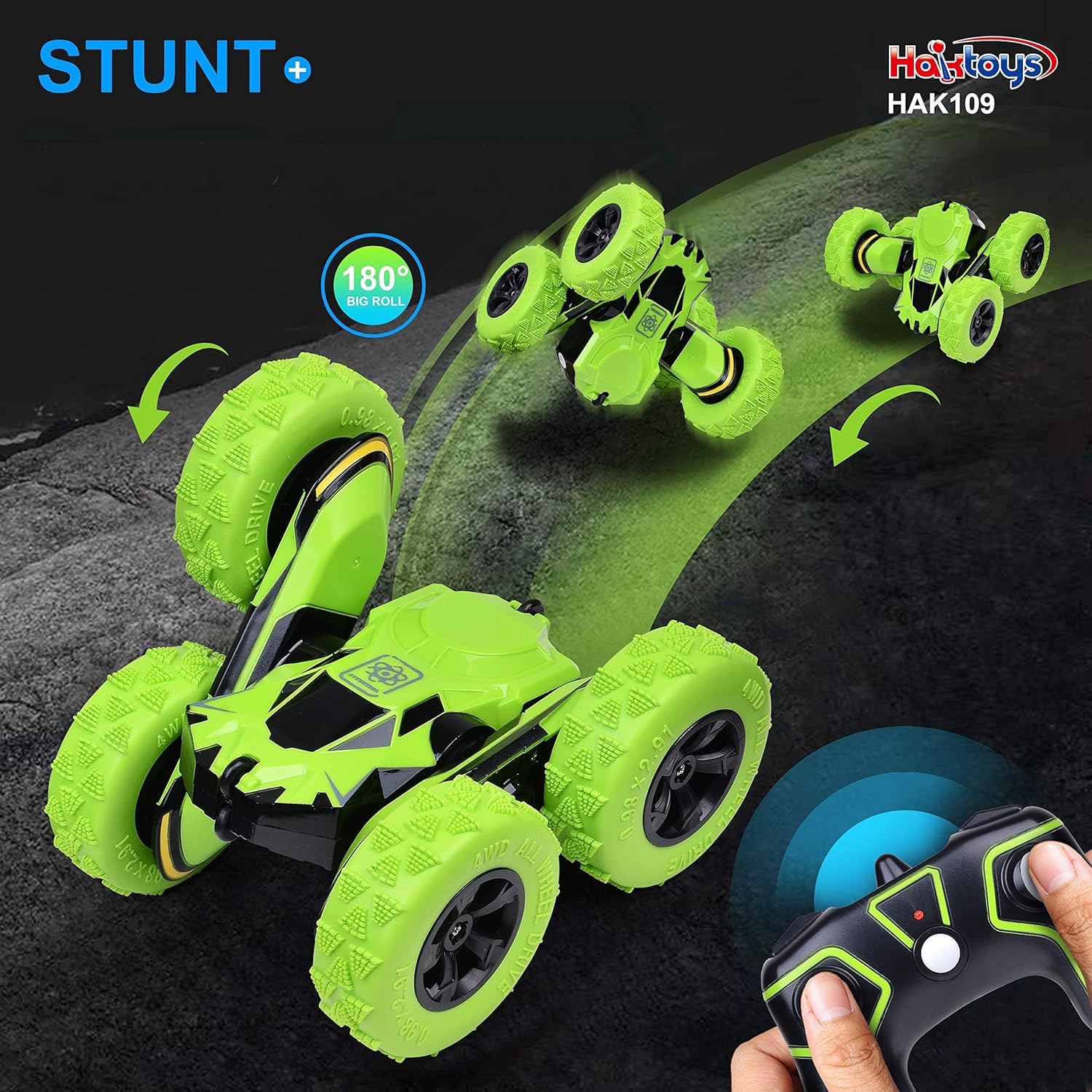 AWD & 4WD – All-wheel-drive.Forward, backward, left turn, right turn, moving wings/legsSturdy and Durable materials for great outdoor performance.3-axial differential allows awesome stuntExtreme 360° Tumbling, Spiral spins, Flip over, 360° front axle spins, Super wheelies, Unequalled performanceExcellent indoor and outdoor conditions including flat surfaces, hardwood floors, all-terrain, grass, beach, etc.