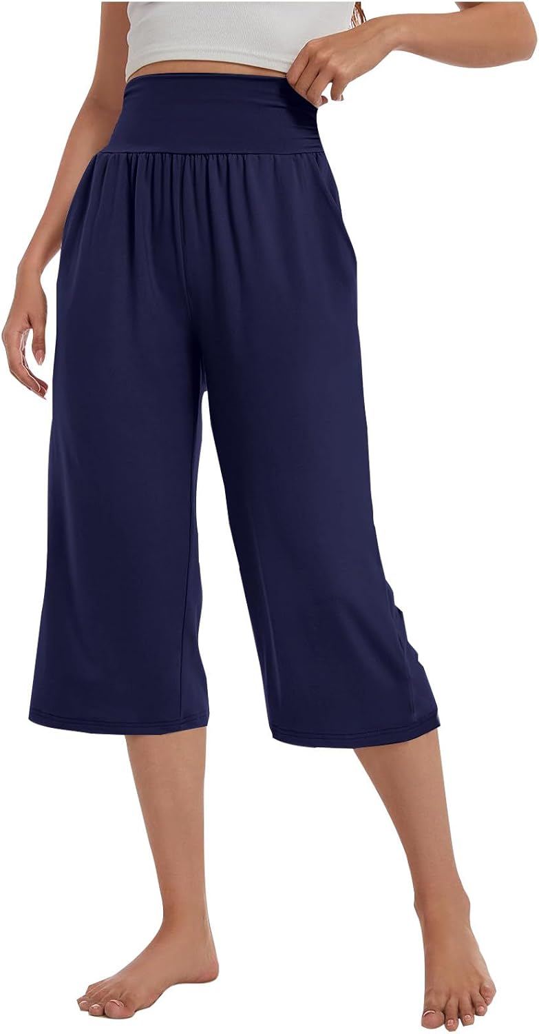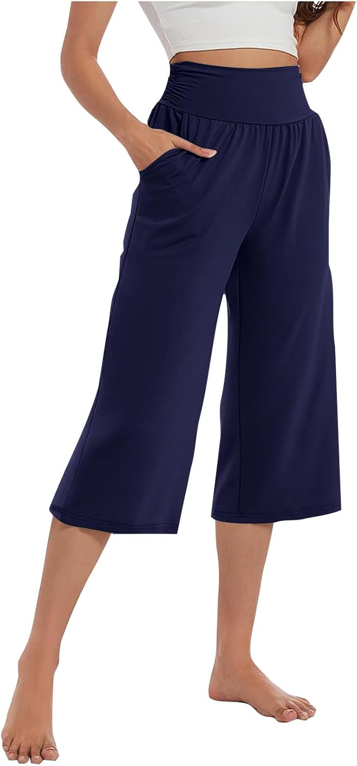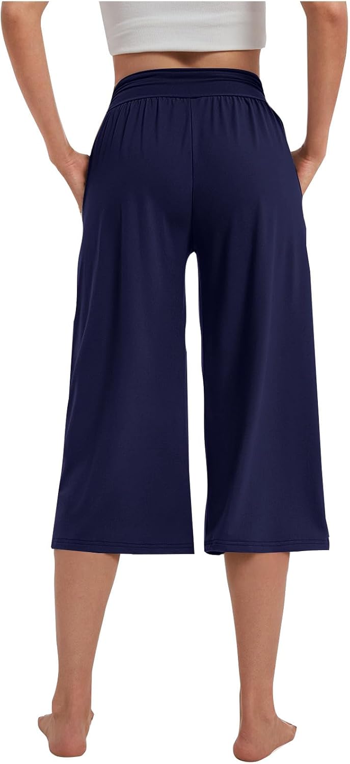 High Waist Wide Leg Yoga Pants for Women Trendy Solid Loose Comfy Capri Lounge Pant Tummy Control Yoga Capris