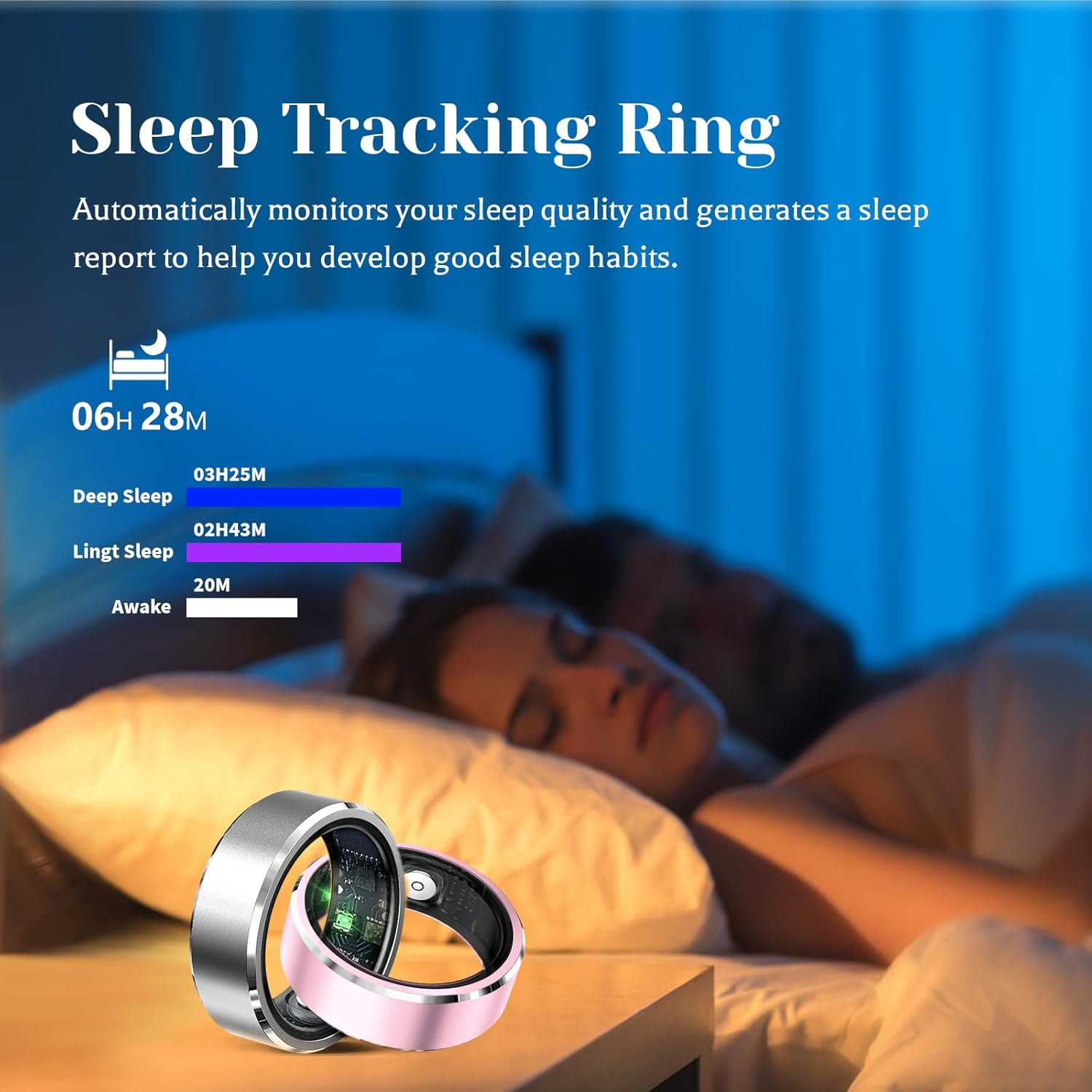 Sleep Health Analysis: The smart ring tracks your sleep patterns, including deep sleep, light sleep, and wake times. Gain valuable insights into your sleep quality and receive personalized recommendations to help you develop better sleep habits, ensuring you wake up refreshed and energized.
