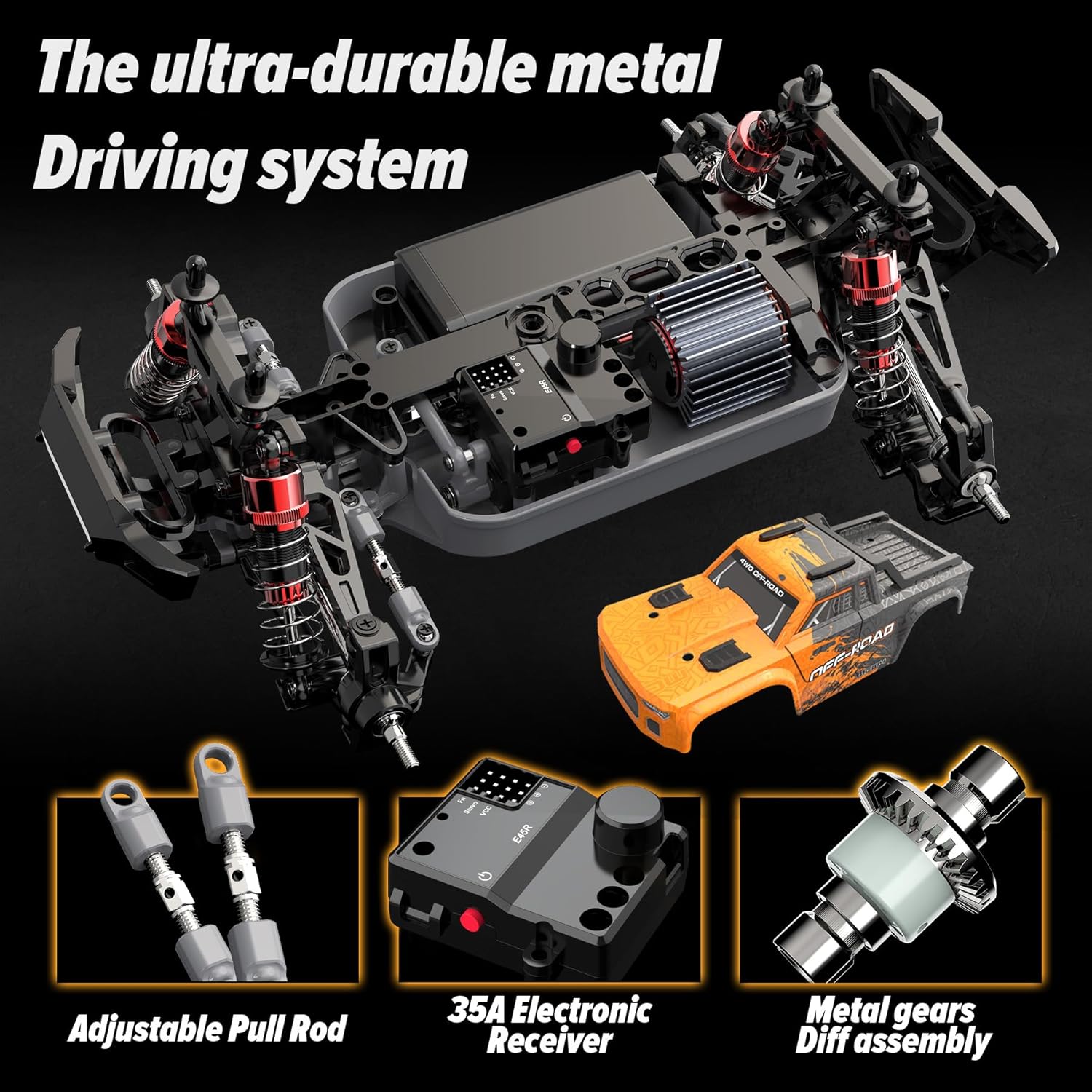 Aluminum Oil-Filled Shocks & Durable Metal Chassis Construction – The remote control car is built around a durable tub style chassis to protect the electronics. 4 aluminum oil-filled shocks and an off road suspension give the rc vehicle high performance on all the roads.