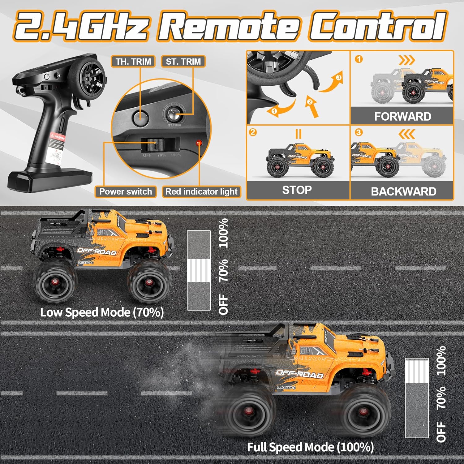 2.4 GHz Speed Adjustment RC system – RC cars for adults kids featuring a 2.4GHz transmitter whiches control range of 150 feet. Users can compete with other racing cars without signal interference, you can race with your friends or kids at the same time. We suggest that beginners set throttle limits at 70% or 100% at the first play, because it has a great explosiveness when start.