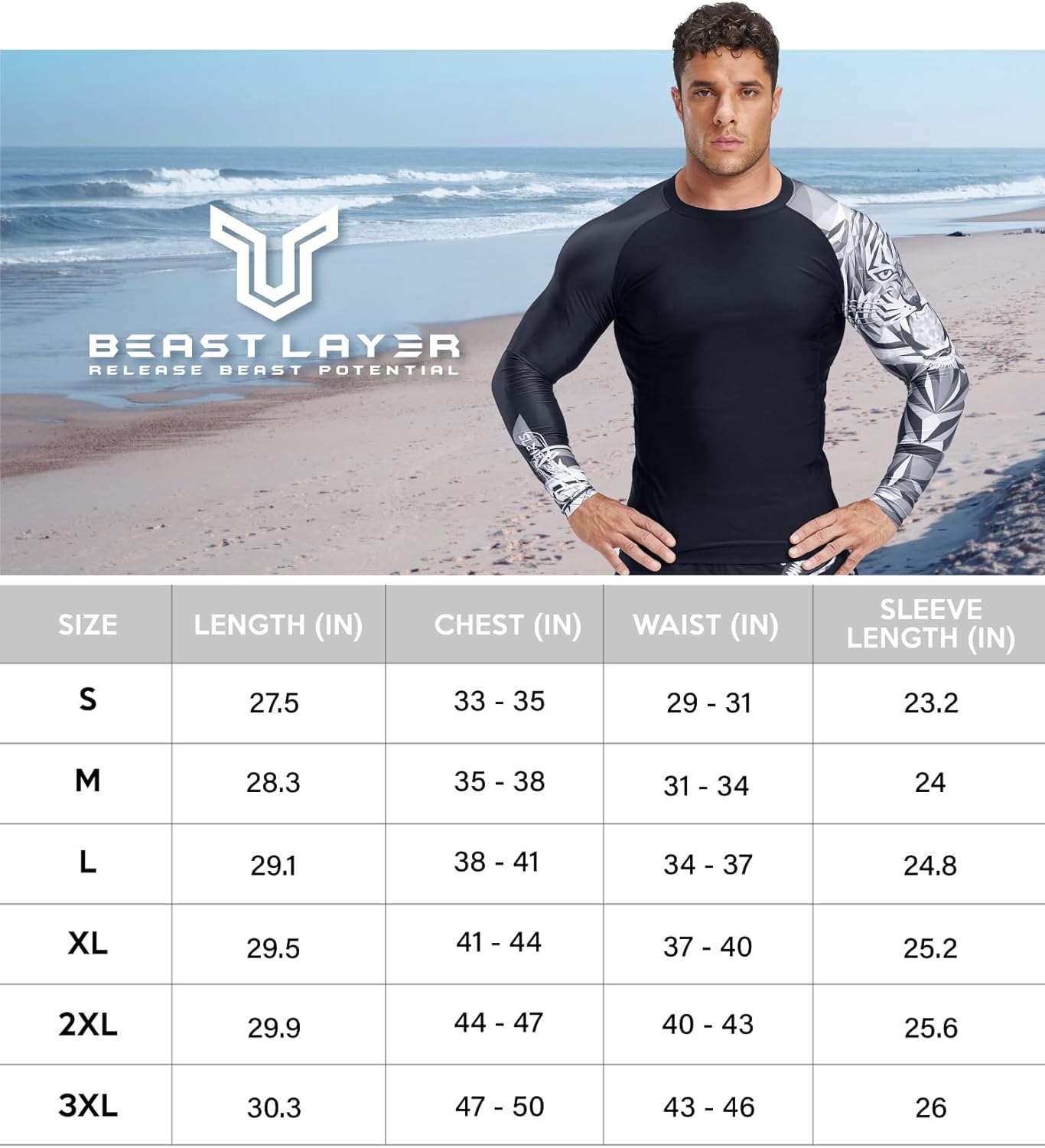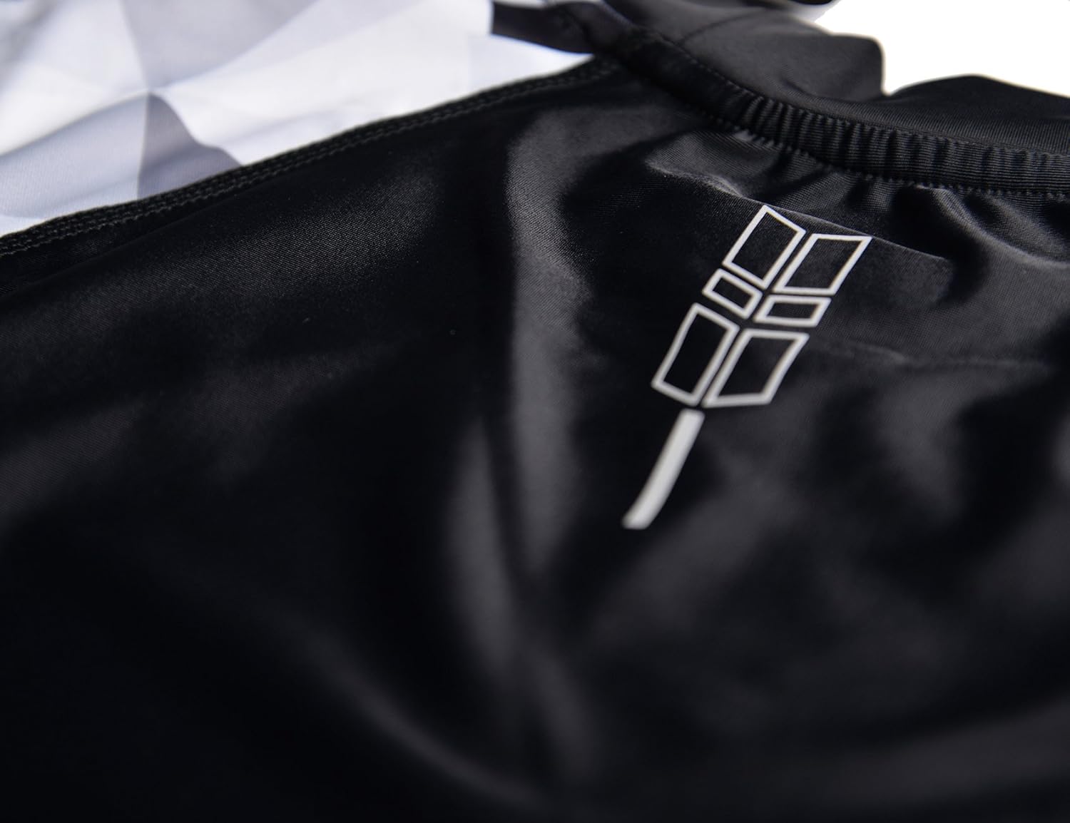 The woven neck tape on the rash guard branded with “BEAST LAYER” can keep the collar in shape after washing.