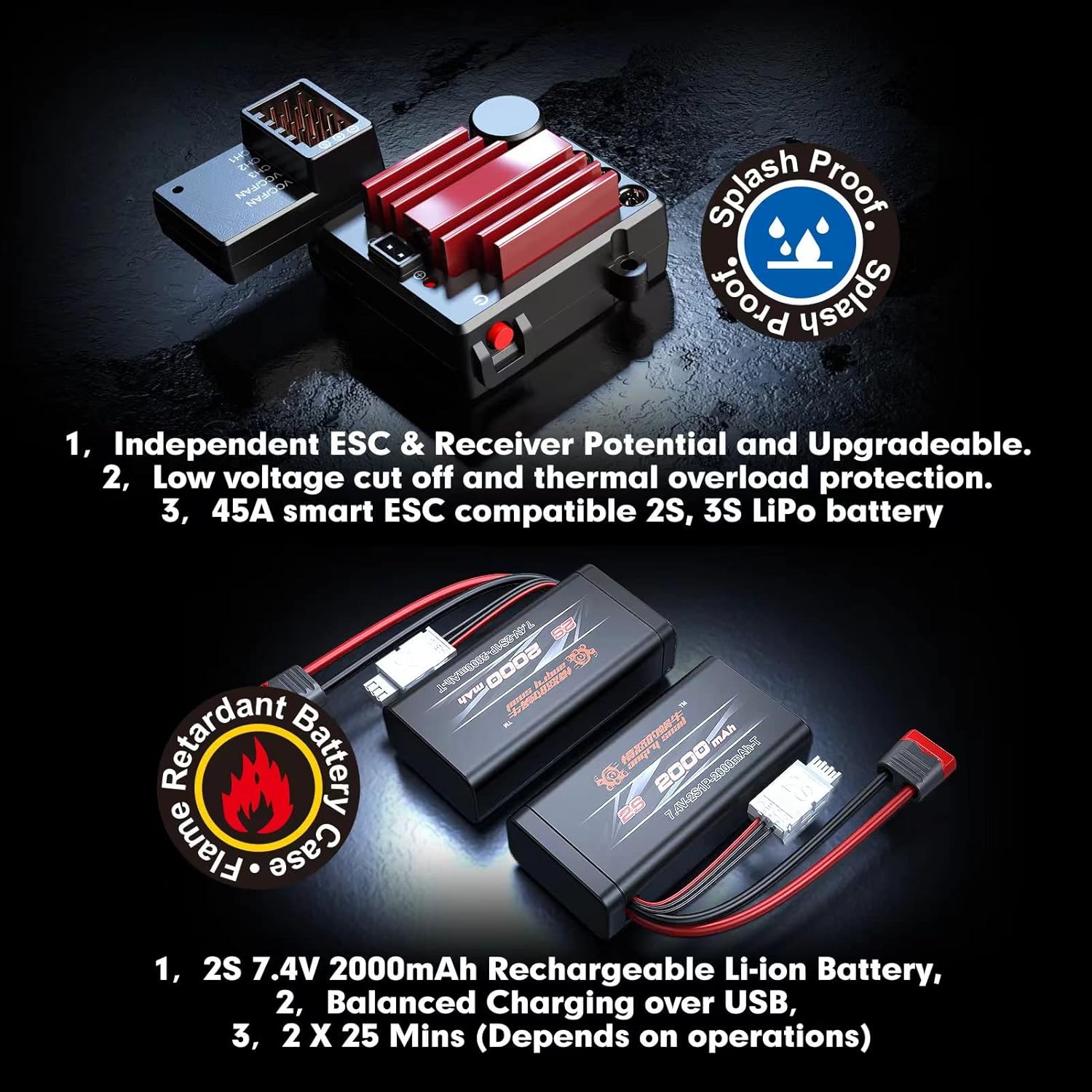 Brushless: Hobby 2845 4200KV, 4 pole high-torque motor with metal heatsink and cooling fans design. Independent receiver and 45A ESC make this car more potential and upgradeable. 2S 7.4V 2000 mAh rechargeable battery and brushless motor bursts out at 25+ mph (40 kph) for adults. (speed measured by GPS)