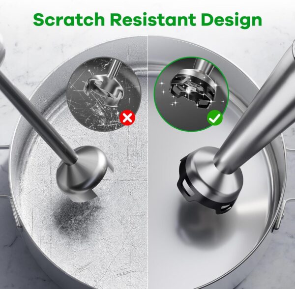 Effortless Clean-Up, Scratch-Free: Features a unique food-grade nylon blade guard designed to minimize suction, preventing scratches on your pots and pans and keeping splashes at bay for a cleaner kitchen and hassle-free clean-up