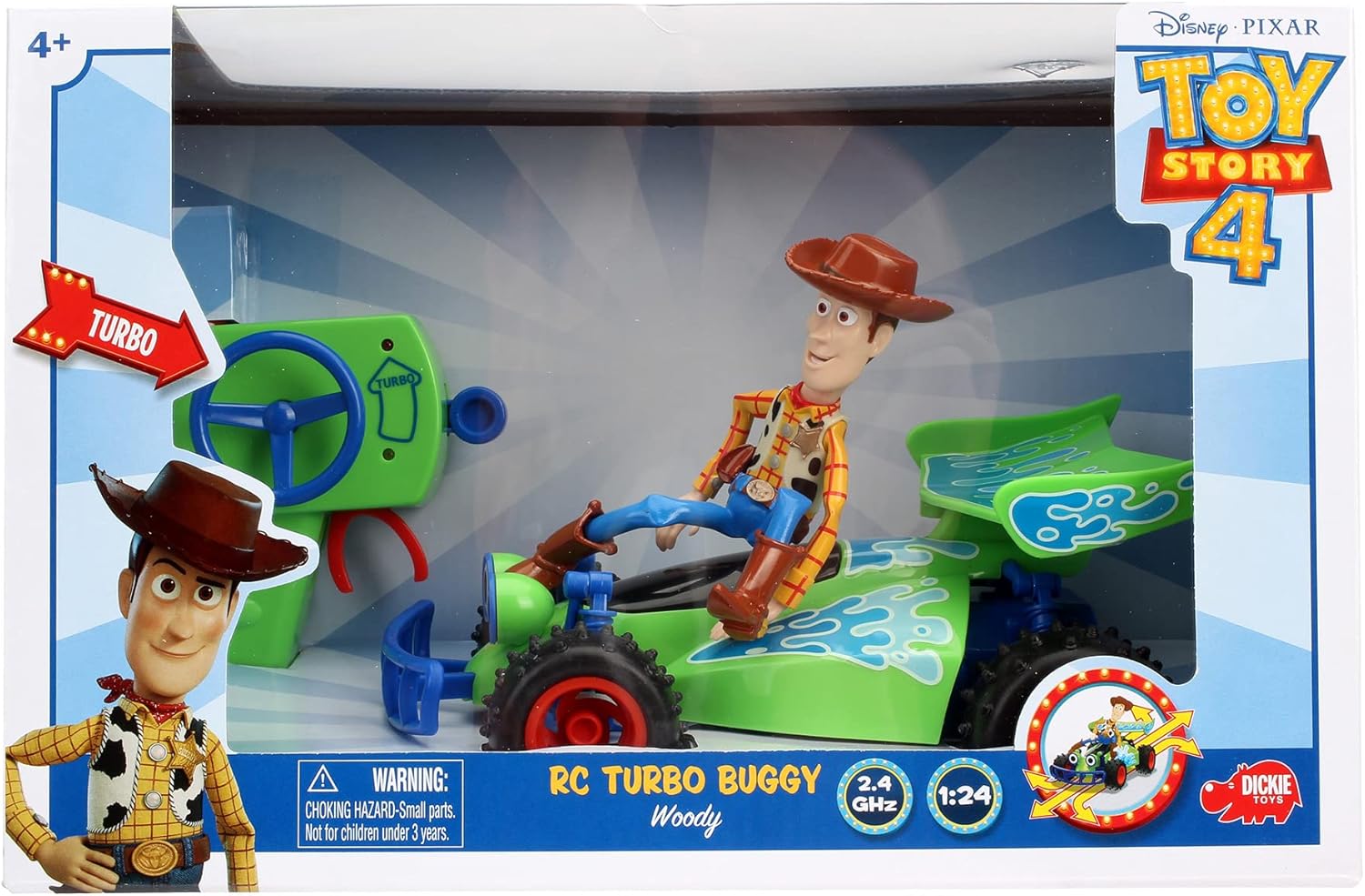 To infinity and beyond! Recreate the action-packed scene where this Buggy R/C was used to get Buzz and Woody back to their friends. This Buggy R/C comes with a pistol grip controller with a turbo feature. The buggy RC car has one of the most recognizable characters in the drivers seat with Woody. But, while Woody is in the drivers seat, you’re really the one in control with an easy-to-operate remote. Drive forward, on to adventure, but feel free to take some exciting spins along the way. Woody’s Buggy features a simple to operate controller with a spin feature. Vehicle is suitable for children ages 3+. This authentically licensed radio control car from Toy Story 4 is a must have for any Disney Pixar collection.